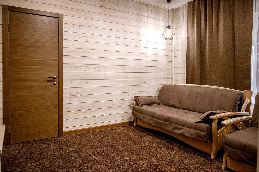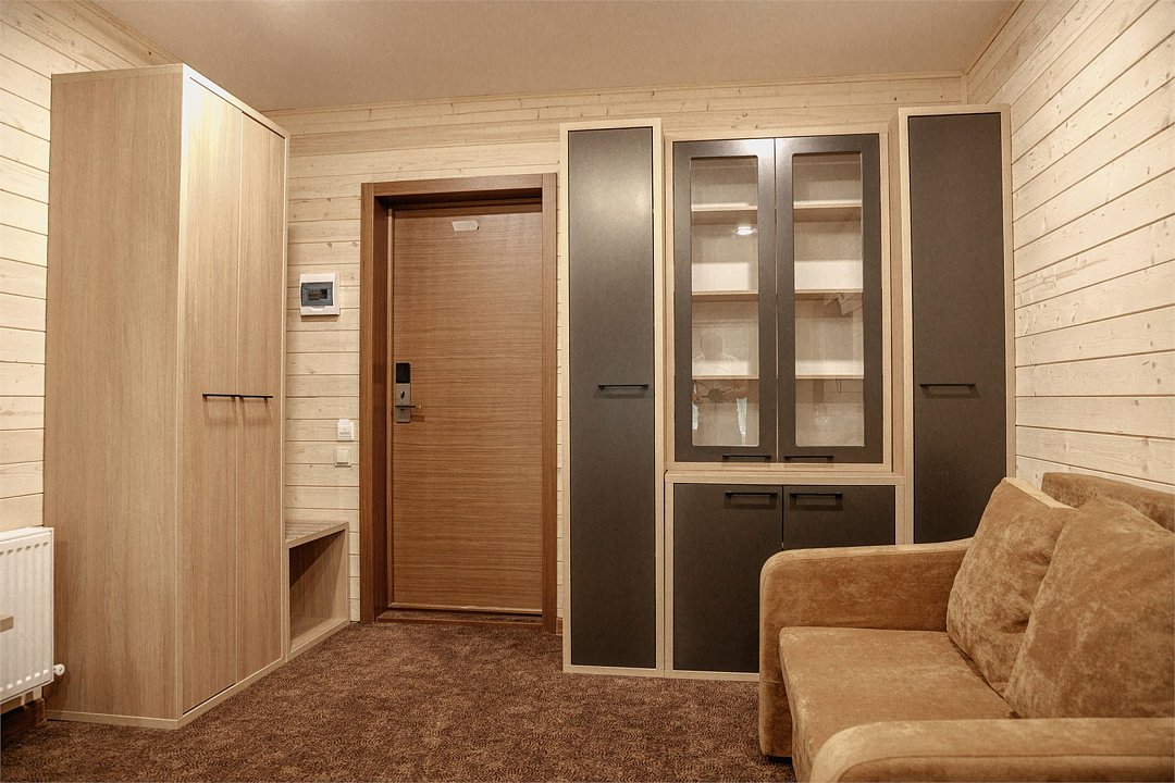 Wi-Fi, интернет, светильник, фен, электронные замки, теплый пол, банные принадлежности, банные полотенца, тапочки, кровать «King size», диван, шкаф для одежды, вешалки, журнальный столик, багажная тумба, зеркало, ковер, чайный набор, чайник, питьевая вода, стаканы, туалетные средства, диван-кровать, мини-холодильник, гостиничная парфюмерия, вид на горы, телевизор со Smart TV, вид на лес, рабочий столВ гостиничном номере