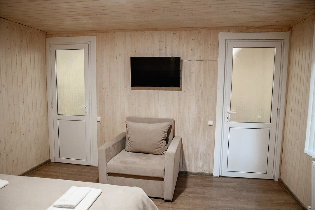 Wi-Fi, интернет, фен, электронные замки, душевая кабина, теплый пол, банные принадлежности, банные полотенца, тапочки, гигиенические средства, балкон, кровать «King size», стулья, шкаф для одежды, вешалки, багажная тумба, зеркало, ковер, набор посуды, чайник, питьевая вода, душ, кресло, стаканы, туалетные средства, цифровое тв, раскладное кресло, мини-холодильник, гостиничная парфюмерия, вид на горы, телевизор со Smart TV, номер для некурящих, вид на лес, рабочий стол, кресло-кроватьВ гостиничном номере
