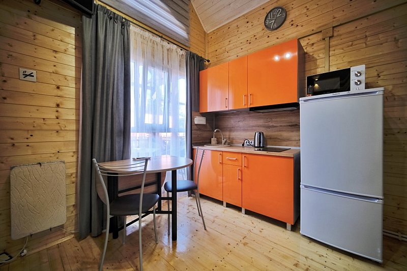 На территории располагаются несколько комфортабельных домиков с кухней, рассчитанных на размещение 7, 4 и 2 человек. Кухонная зона в домах оборудована бытовой техникой и набором посуды.