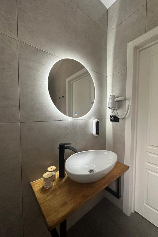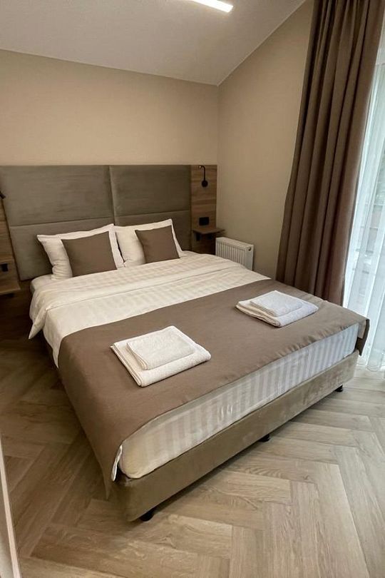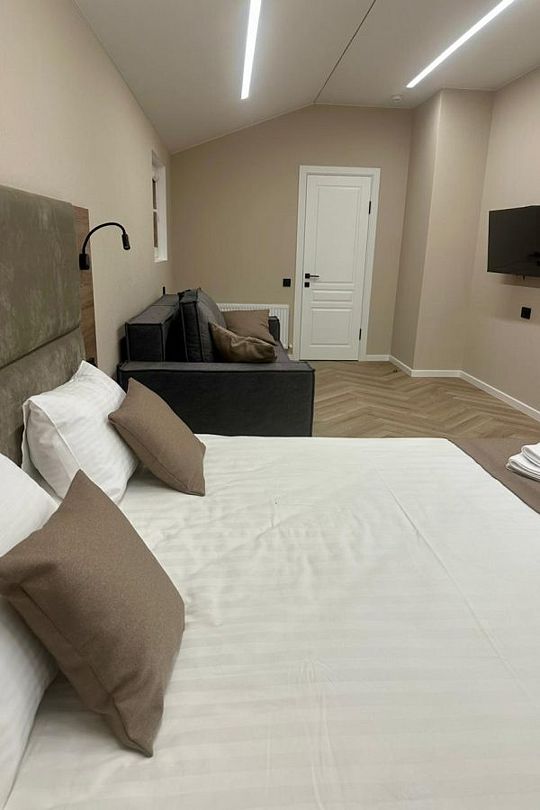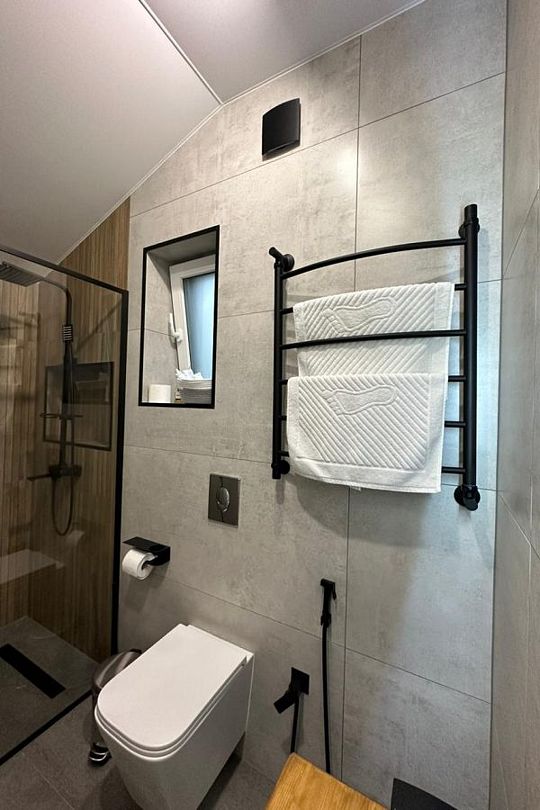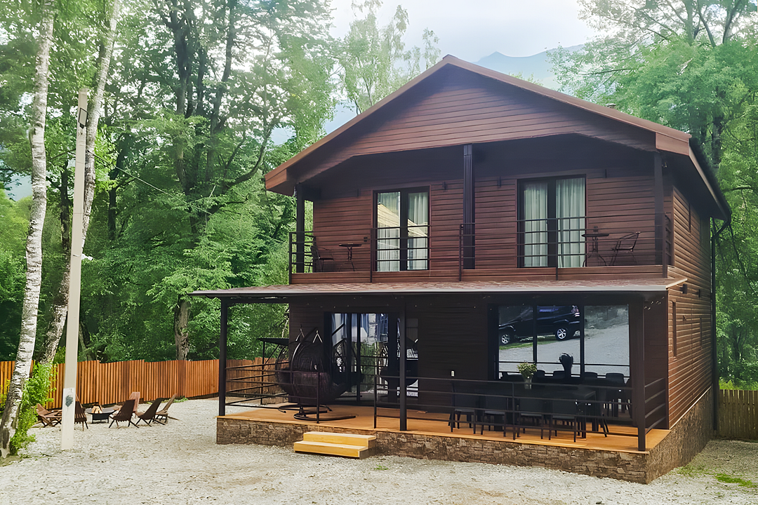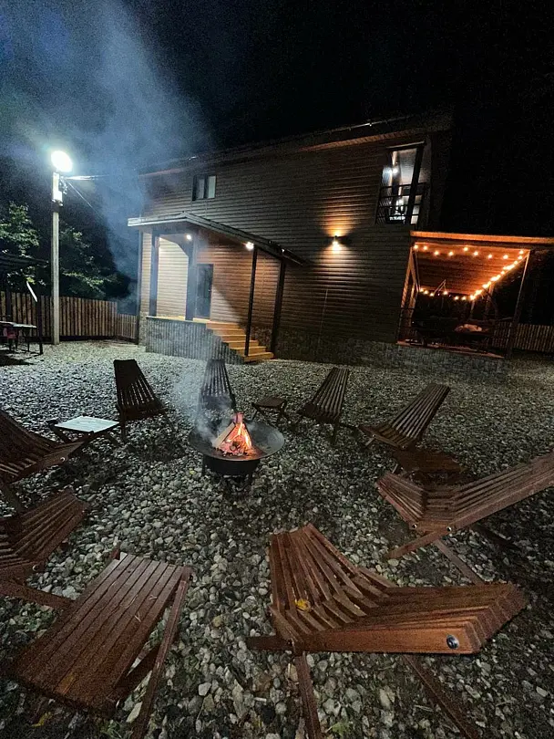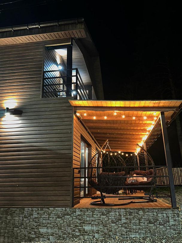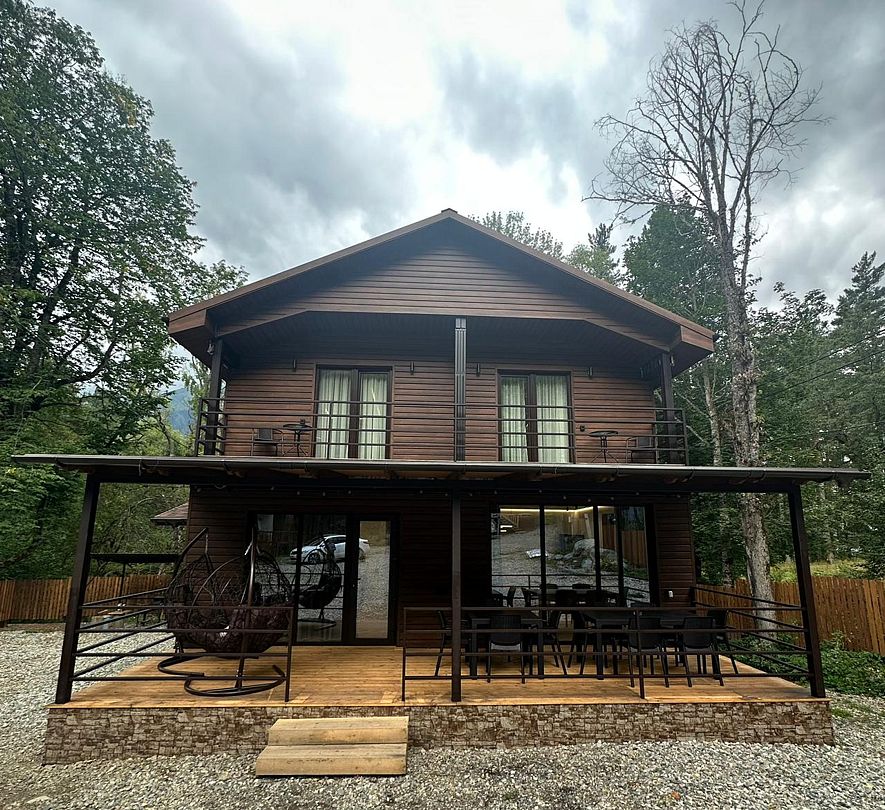 Среди удобств — четыре стильные спальни в современном стиле «лофт», каждая из которых оснащена собственной ванной комнатой, что обеспечивает полный комфорт и приватность для всех. Две спальни имеют выход на балкон, откуда открываются живописные пейзажи. Домик оборудован телевизором с доступом в интернет, что делает пребывание еще более приятным.
