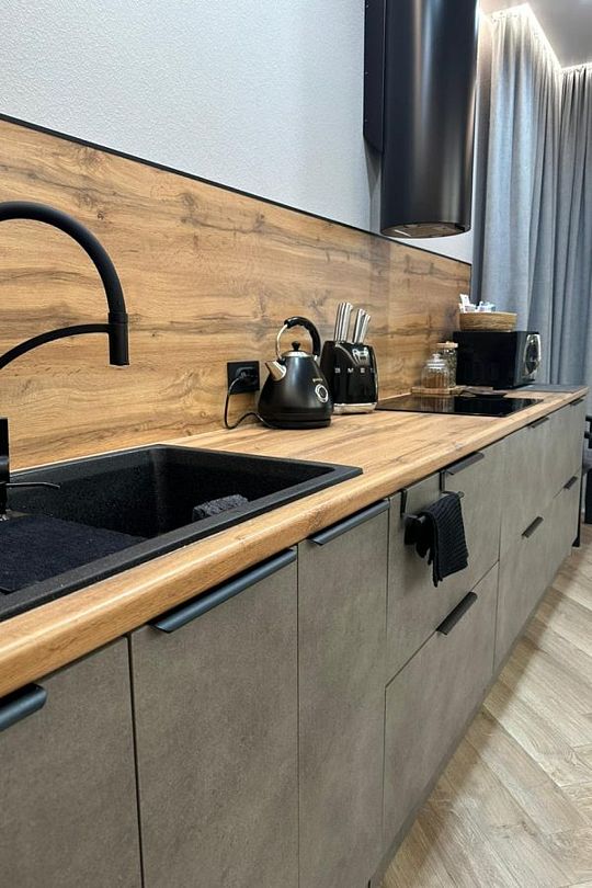 На кухне есть всё необходимое: холодильник, микроволновая печь, индукционная плита, посудомоечная машина, стиральная машина, а также посуда и все для комфортного проживания.