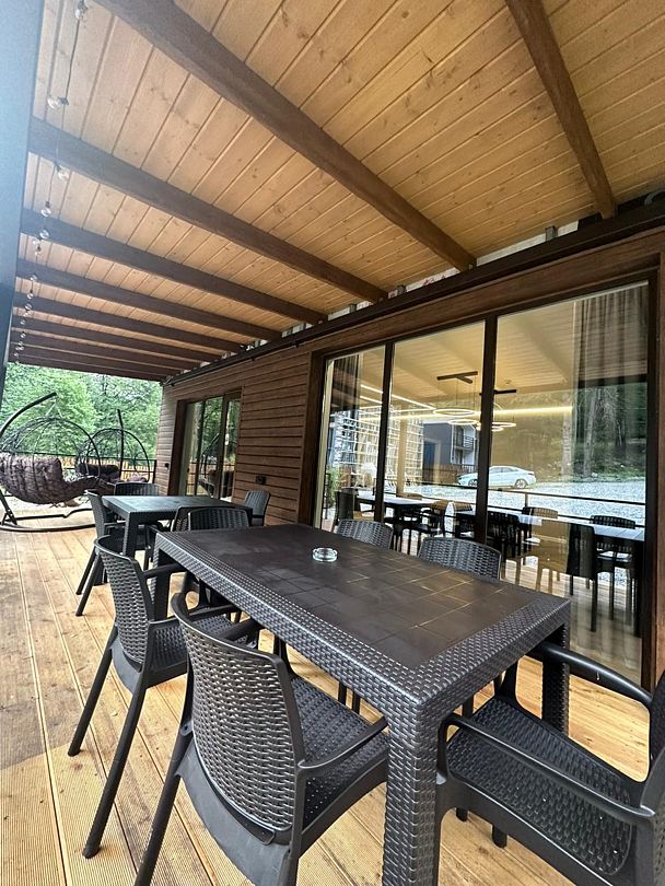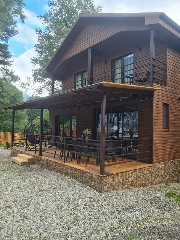 В течение дня вы сможете исследовать горные тропы, кататься на лыжах и наслаждаться живописными водопадами и чистыми озерами. А после насыщенного дня вас ждет терраса, где можно расслабиться с горячим чаем в окружении близких людей, делясь впечатлениями и создавая незабываемые моменты.