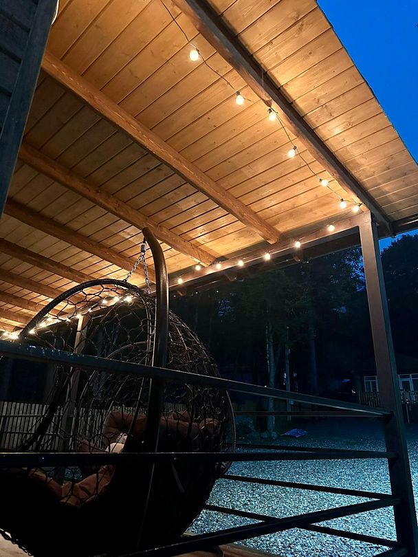 На большой террасе установлены стол и стулья, а также есть место для отдыха на качелях.
