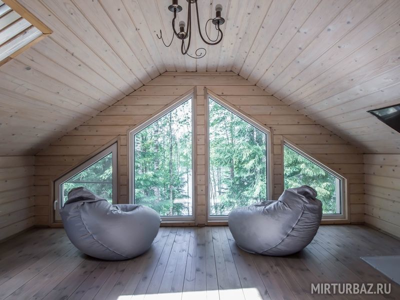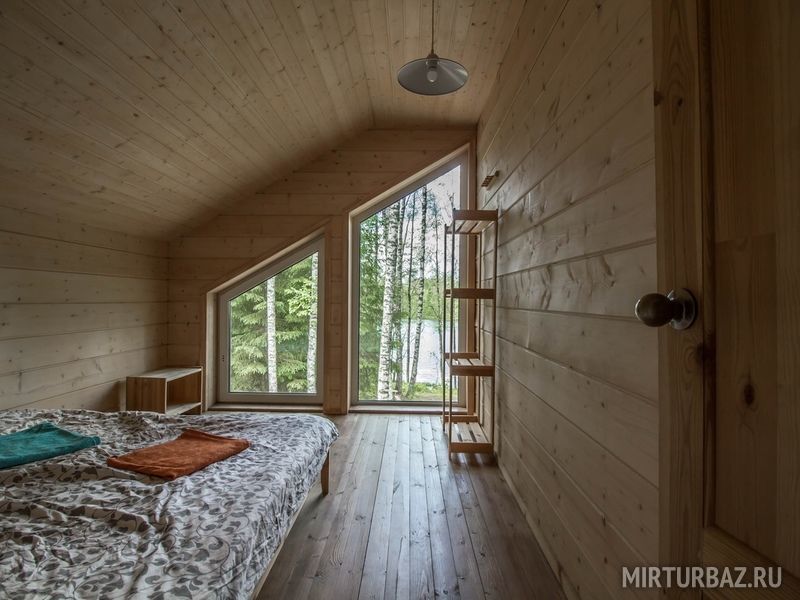 4 отдельные спальни, две из которых имеют панорамный вид на озеро. В каждой спальне установлена 2-х спальная кровать. И одна детская кроватка на коттедж.