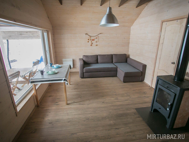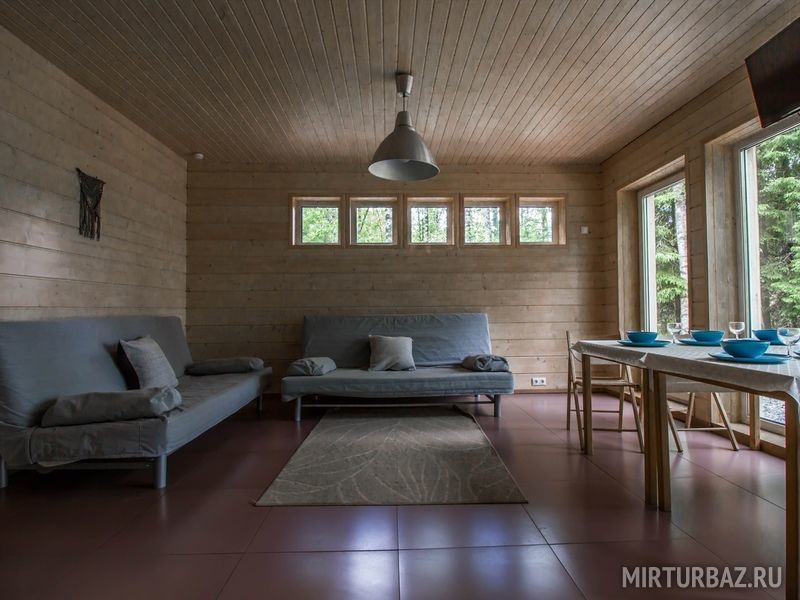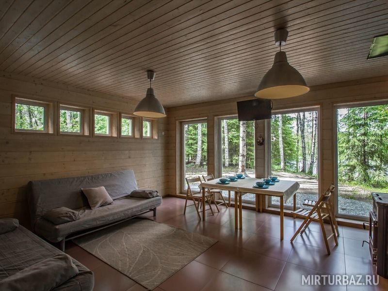 Панорамная гостиная с камином, двумя диванами и двойным обеденным столом, комфортная кухня с холодильником 2м и всей необходимой посудой, двойная душевая и сауна на 5-6 человек.