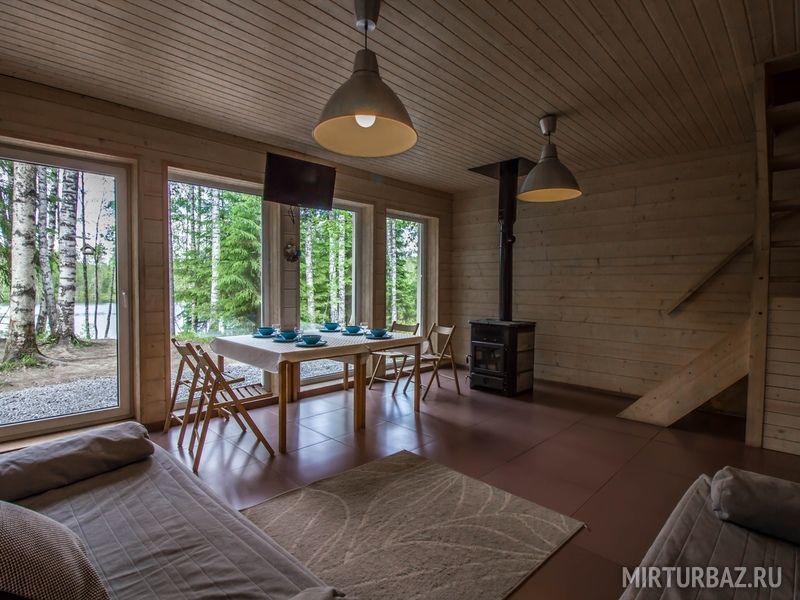 Участок расположен на берегу живописного озера Ахвенлампи в Карелии 15 м от линии воды в уединенном месте (до ближайших соседей 2 км). Все коттеджи расположены вдоль береговой линии и имеют изолированную зону отдыха. Расстояние между домами 40-50 метров.
