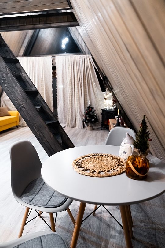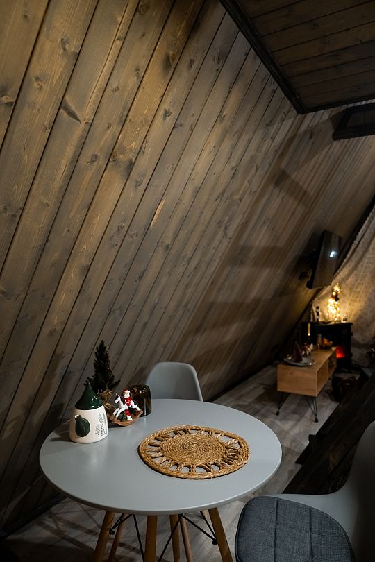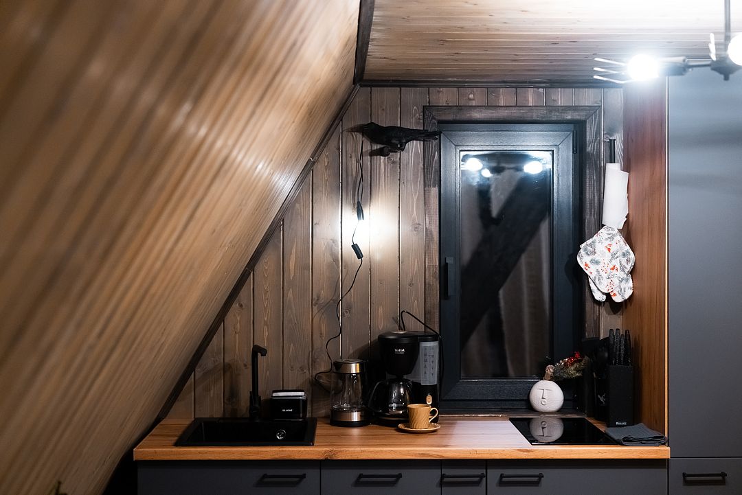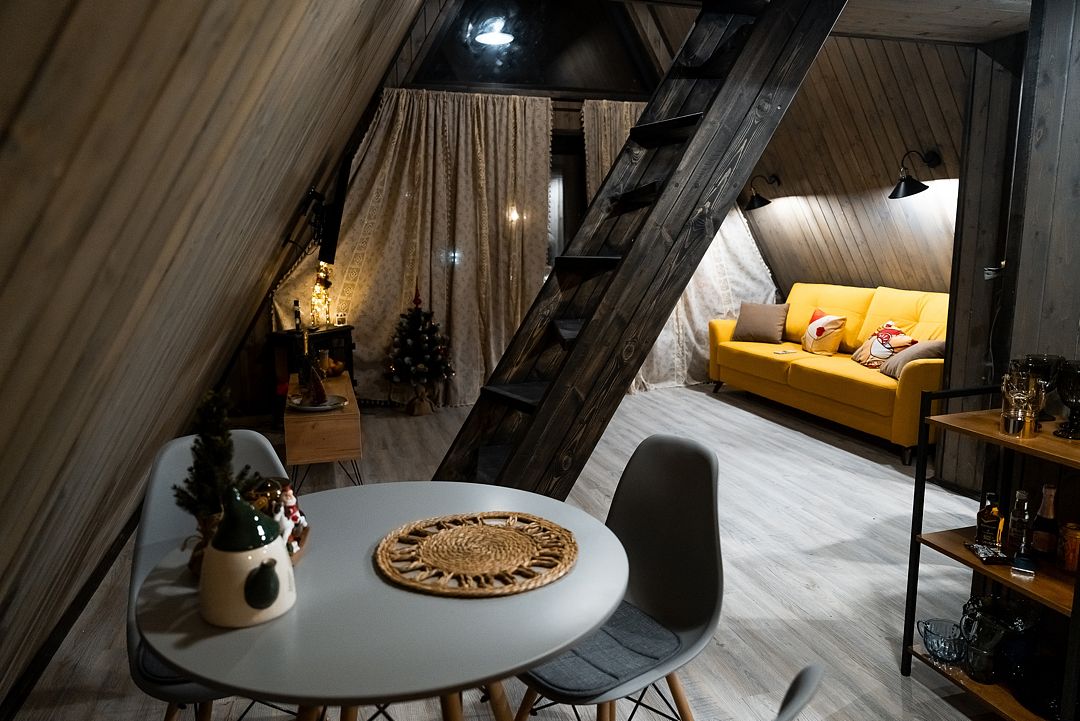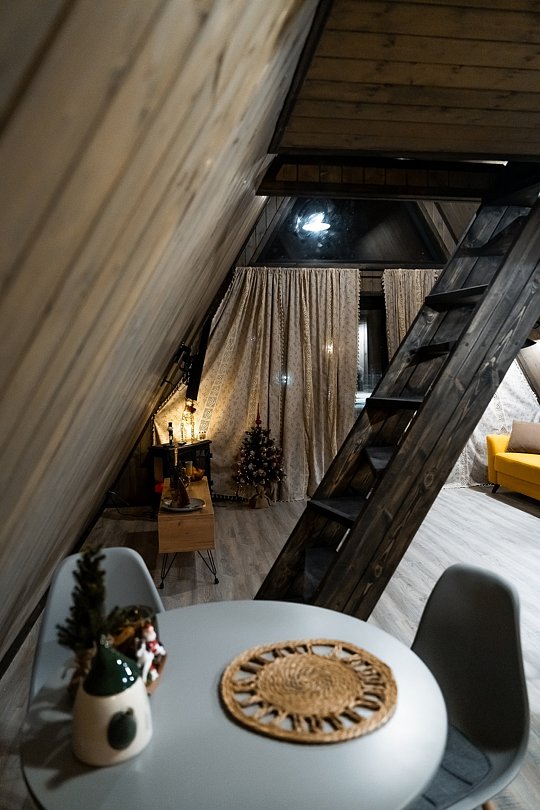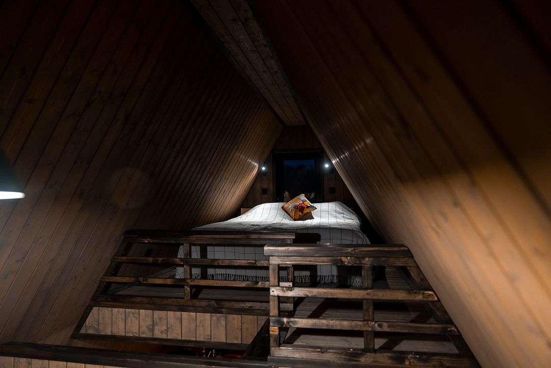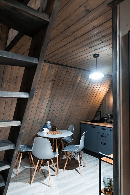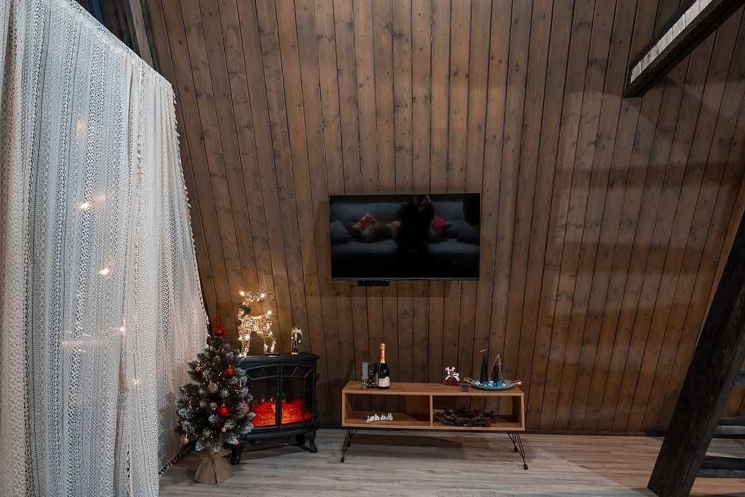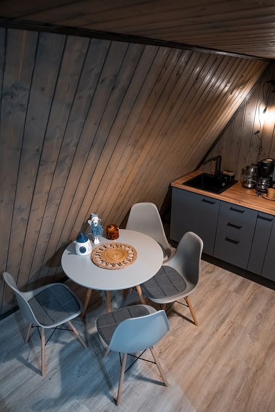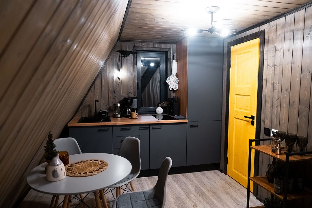 В каждом доме имеется: полностью оборудованная кухня-гостиная с полноценным раскладным диваном на 2 спальных места. В распоряжении гостей столовые приборы, кастрюли, сковородки, чайник, микроволновка, холодильник, плита. Для любителей кофе имеется кофемашина. На втором этаже большая двуспальная кровать с ортопедическим матрасом. Мягкое постельное белье. При необходимости можно оборудовать 5 спальное место, за дополнительную стоимость.
