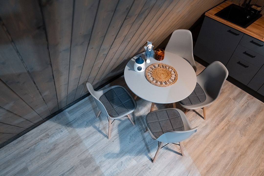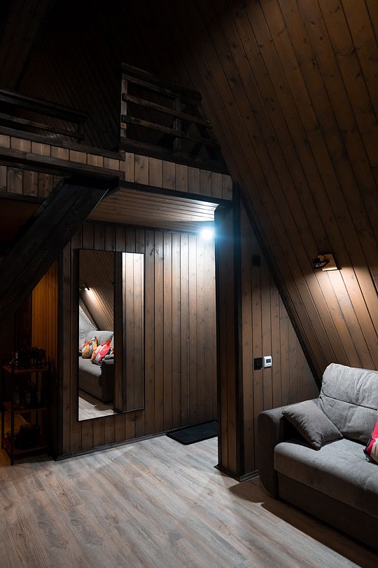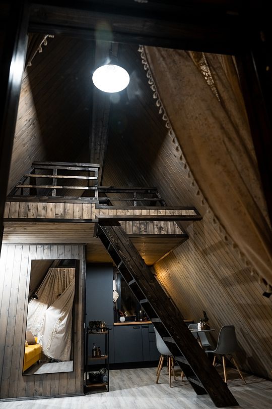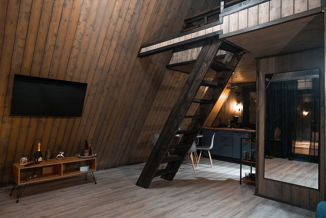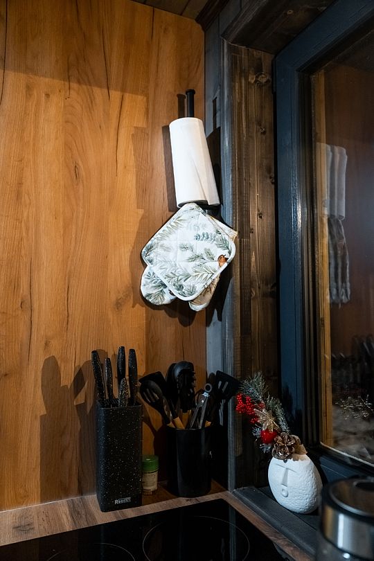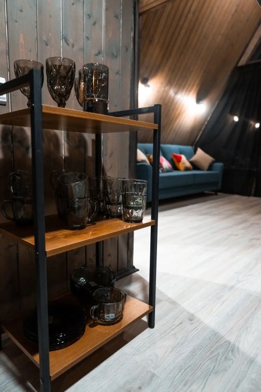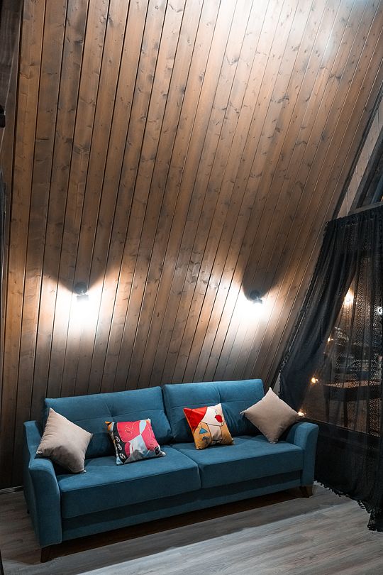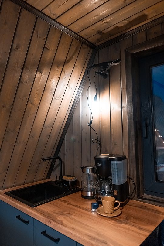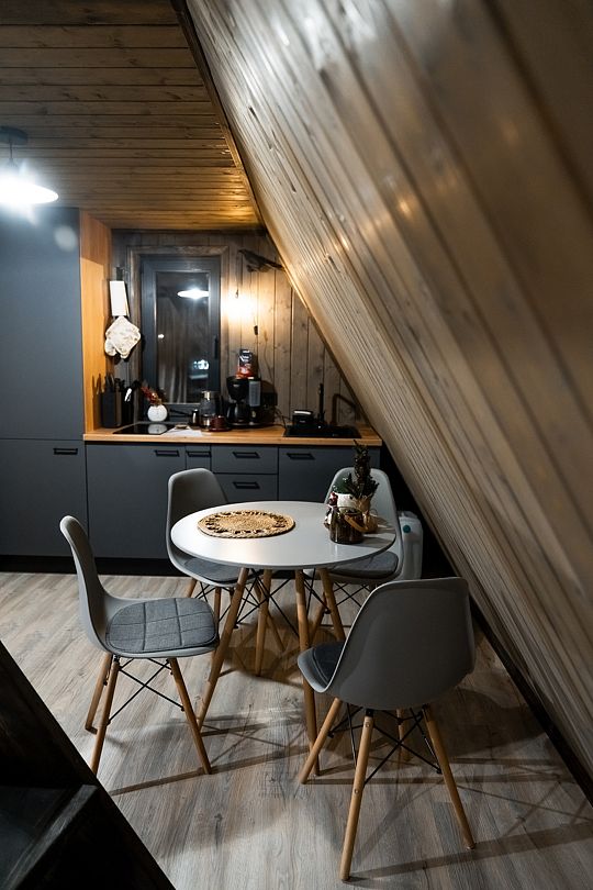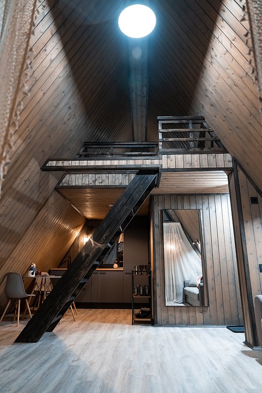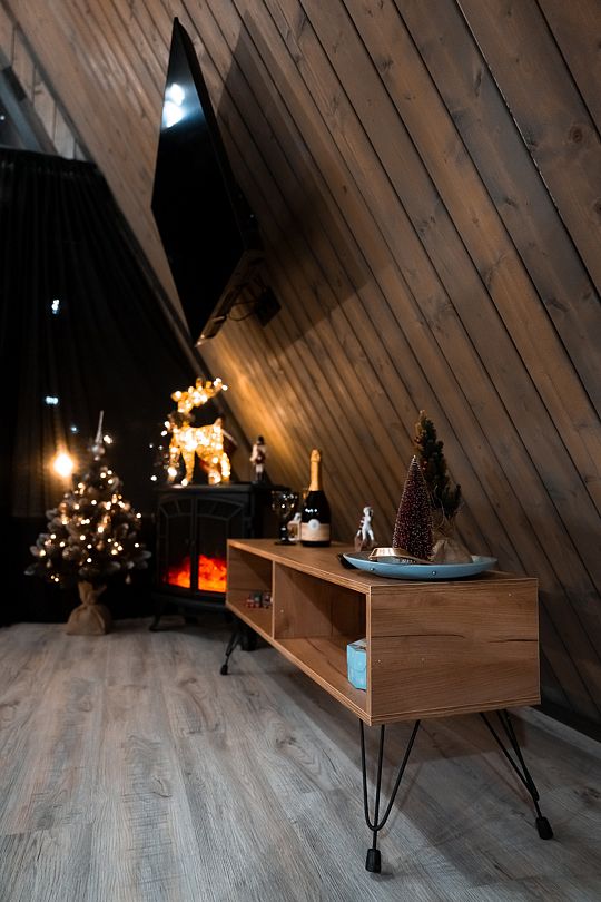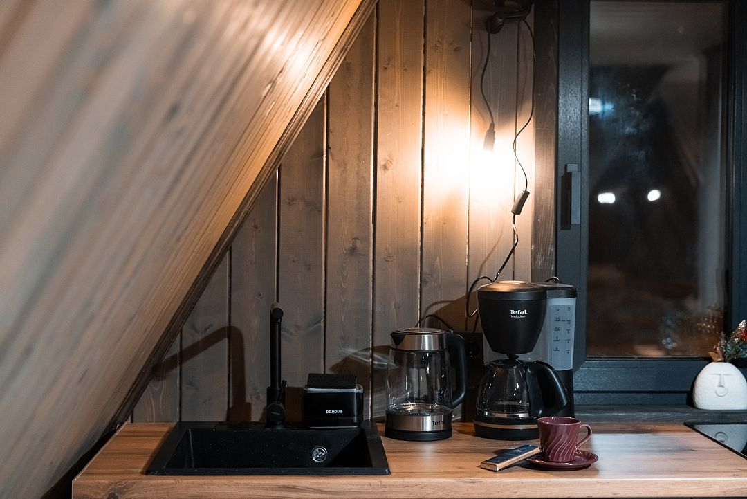 В каждом доме имеется: полностью оборудованная кухня-гостиная с полноценным раскладным диваном на 2 спальных места. В распоряжении гостей столовые приборы, кастрюли, сковородки, чайник, микроволновка, холодильник, плита. Для любителей кофе имеется кофемашина. На втором этаже большая двуспальная кровать с ортопедическим матрасом. Мягкое постельное белье. При необходимости можно оборудовать 5 спальное место, за дополнительную стоимость.