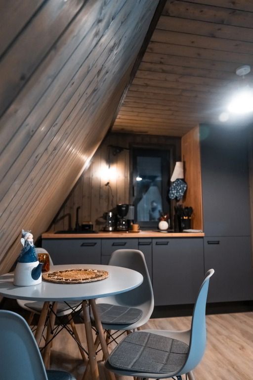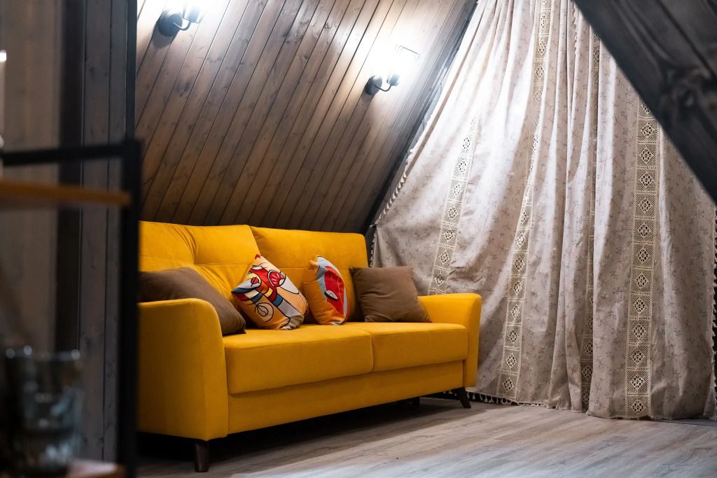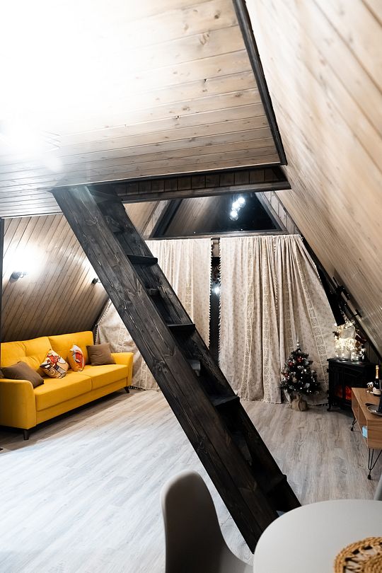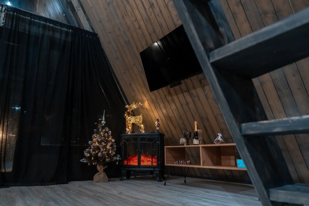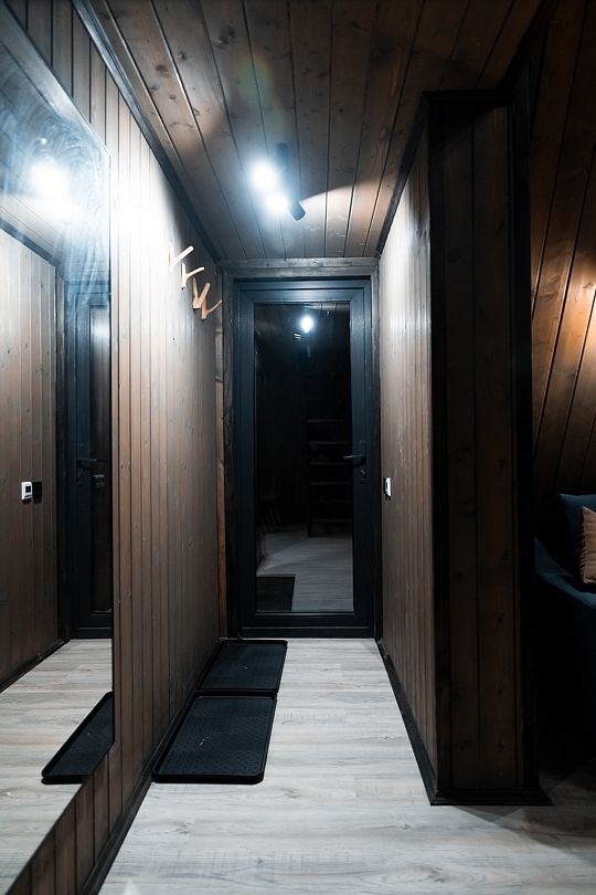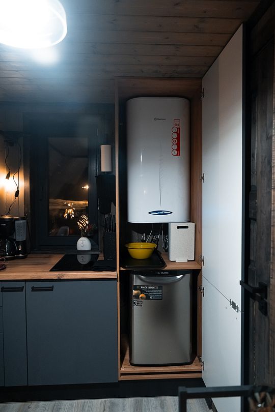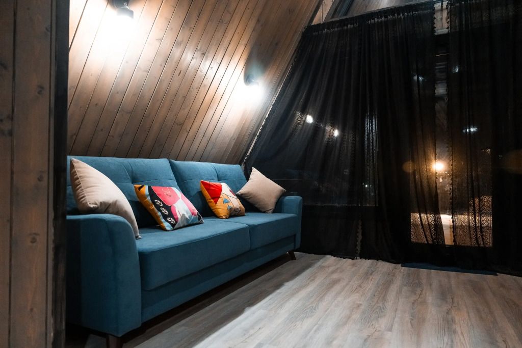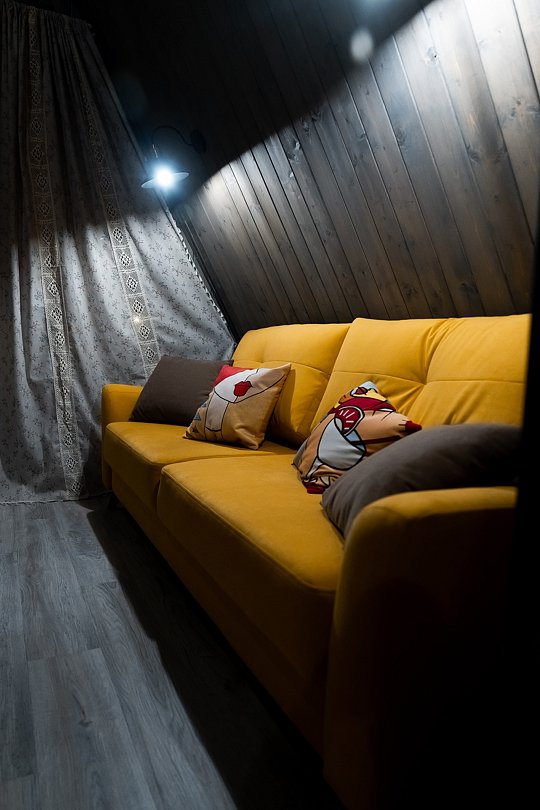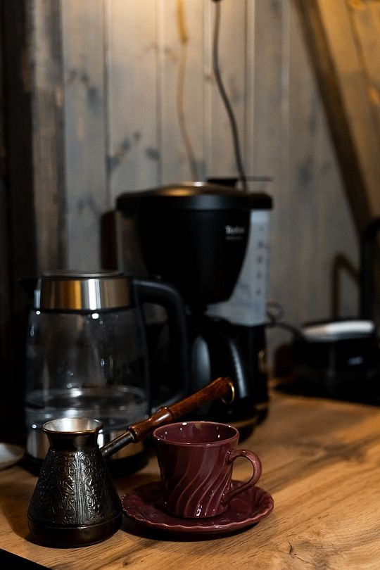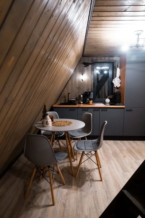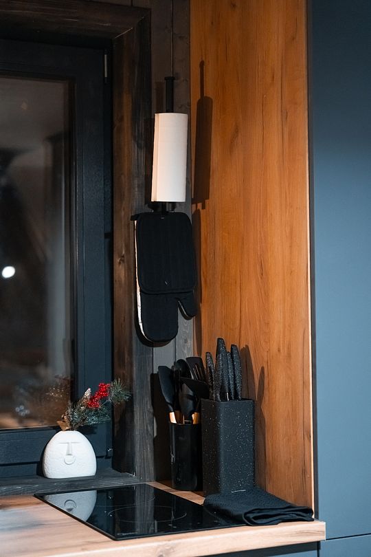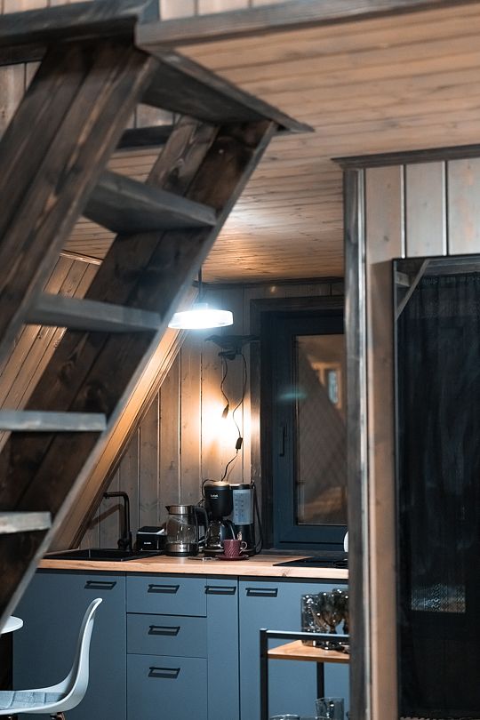 В каждом доме имеется: полностью оборудованная кухня-гостиная с полноценным раскладным диваном на 2 спальных места. В распоряжении гостей столовые приборы, кастрюли, сковородки, чайник, микроволновка, холодильник, плита. Для любителей кофе имеется кофемашина. На втором этаже большая двуспальная кровать с ортопедическим матрасом. Мягкое постельное белье. При необходимости можно оборудовать 5 спальное место, за дополнительную стоимость.