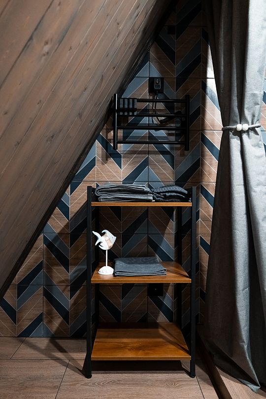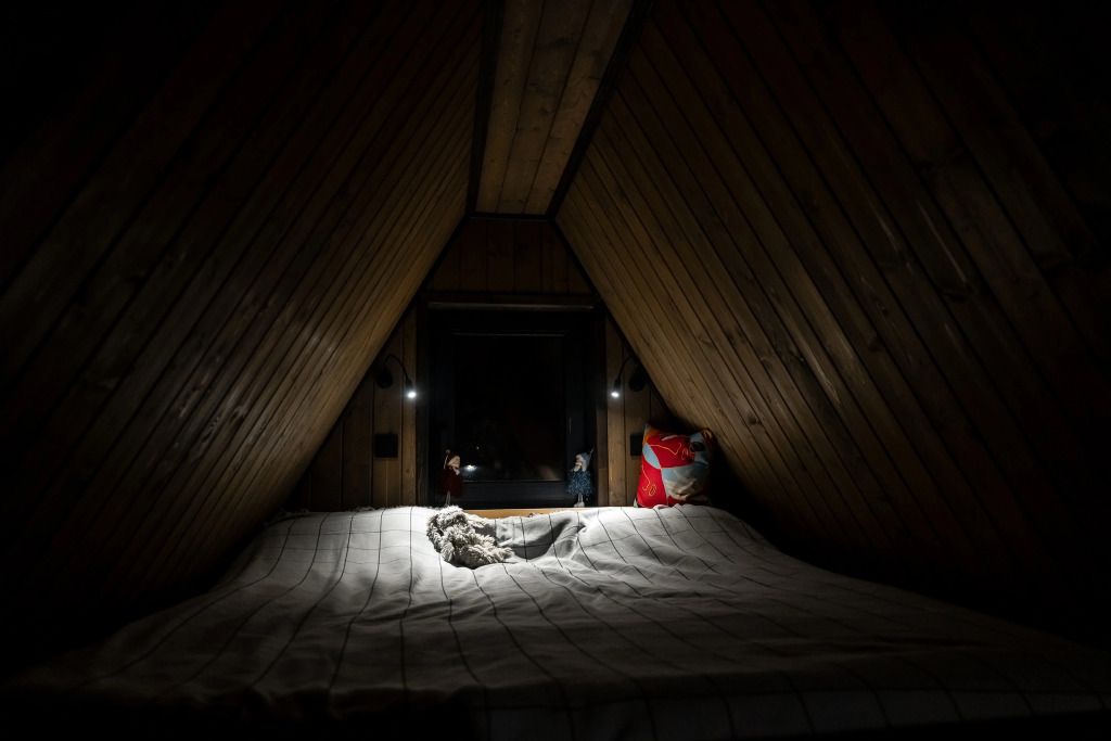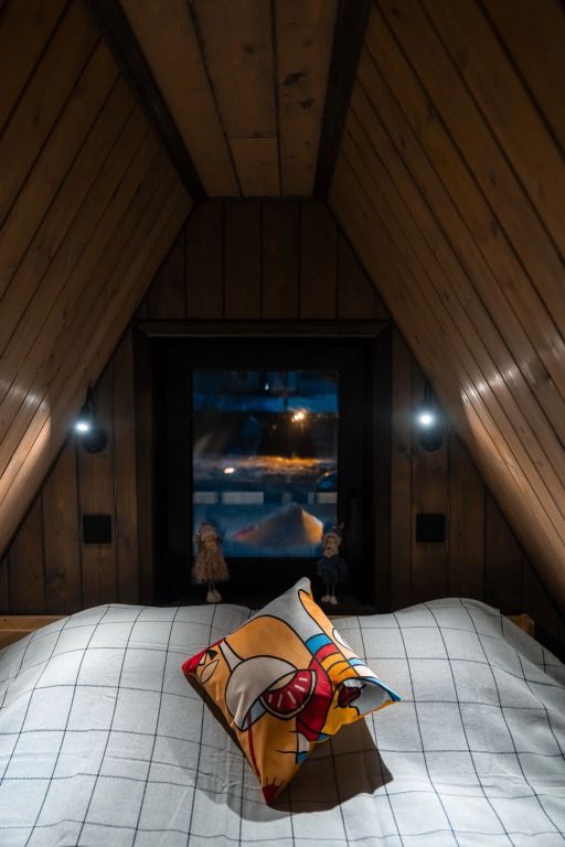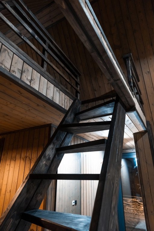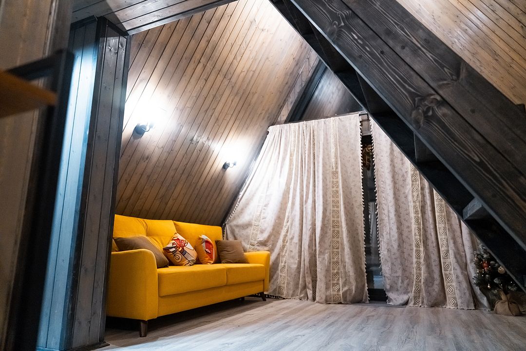 На втором этаже большая двуспальная кровать с ортопедическим матрасом. Мягкое постельное белье.