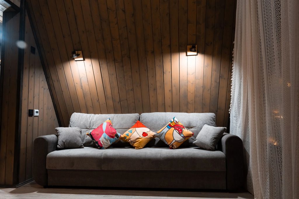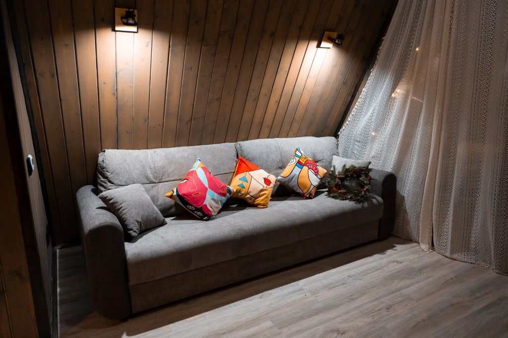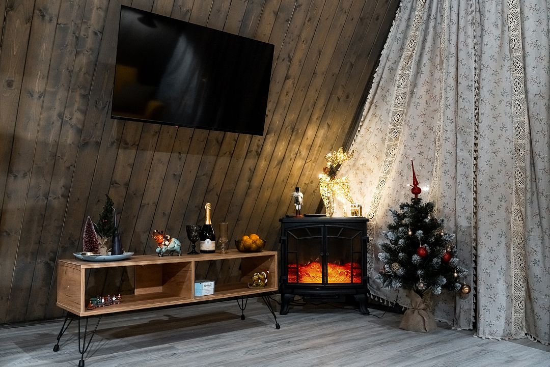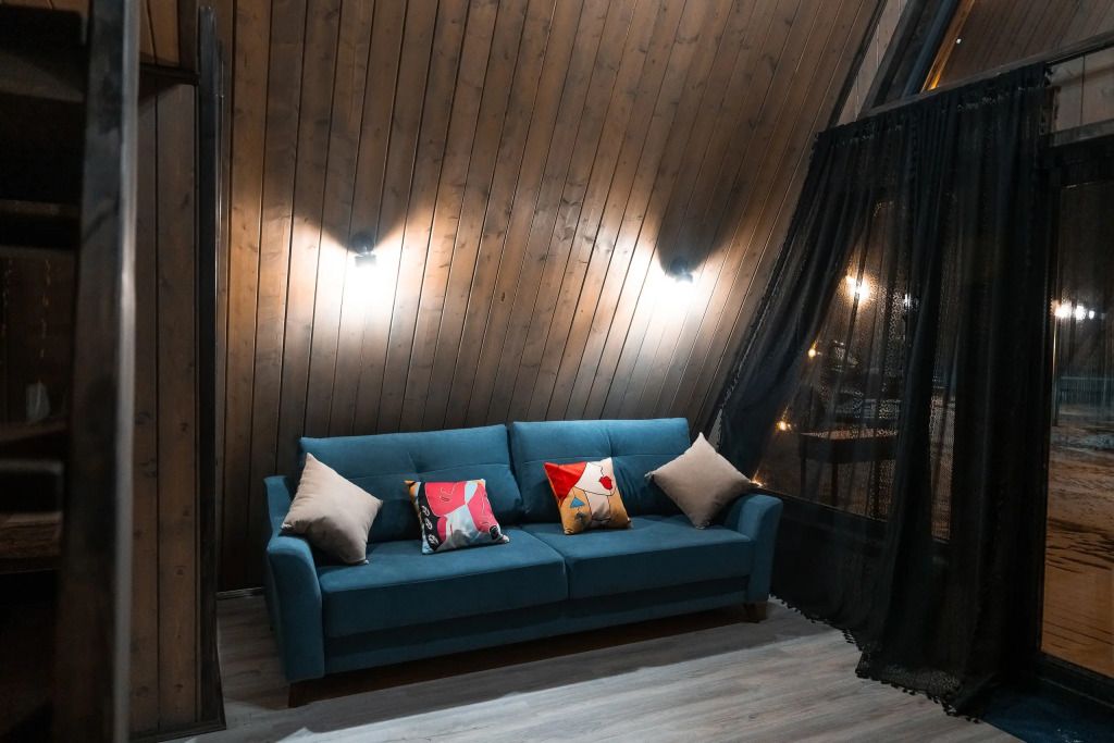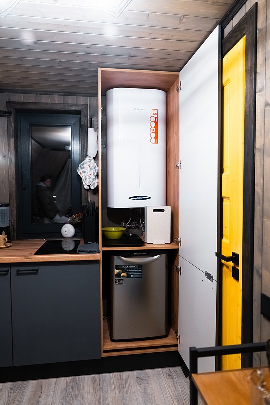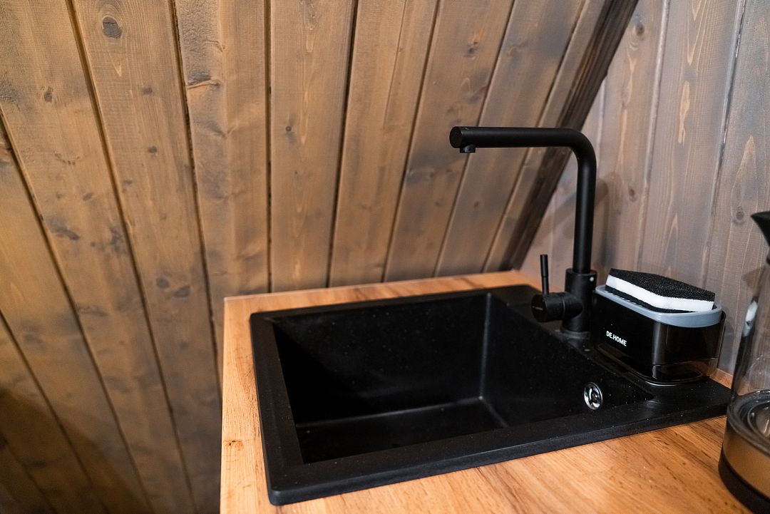В каждом доме имеется: полностью оборудованная кухня-гостиная с полноценным раскладным диваном на 2 спальных места