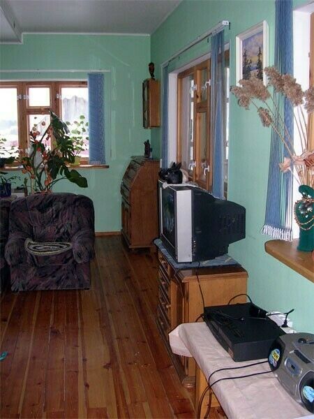 В доме: Оборудованная кухня и гостиная разделены аркой. В гостиной мягкая мебель, стол, телевизор, муз. центр. 3 спальни на втором этаже: 1 спальня - двуспальная и односпальная кровать, 2 спальня - полутороспальная кровать, 3 спальня-две односпальные кровати) 1 спальня на первом (две односпальные кровати). Душ и туалет на двух этажах. Отопление электрическое и печное.