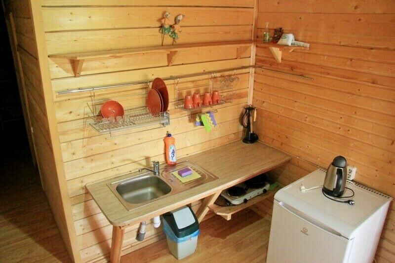 В домике открытая веранда, кухня, две комнаты, душ, туалет. На кухне холодильник, плитка, чайник, вся посуда.