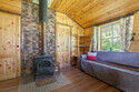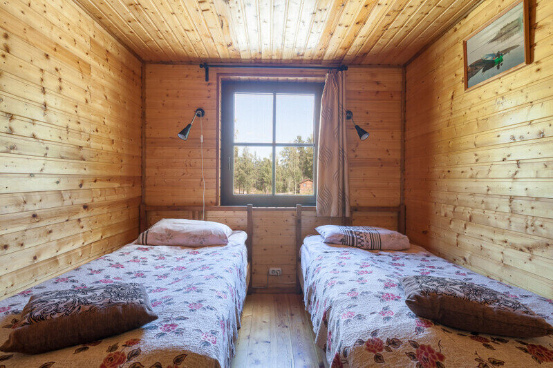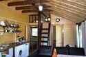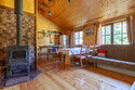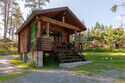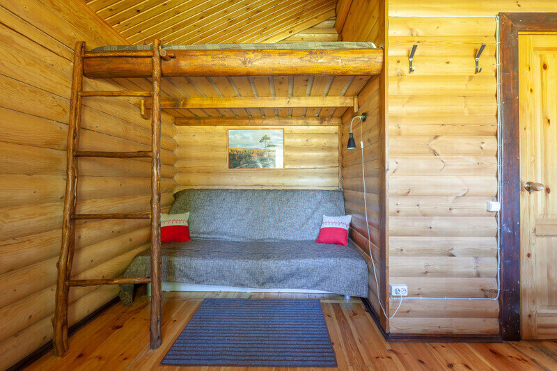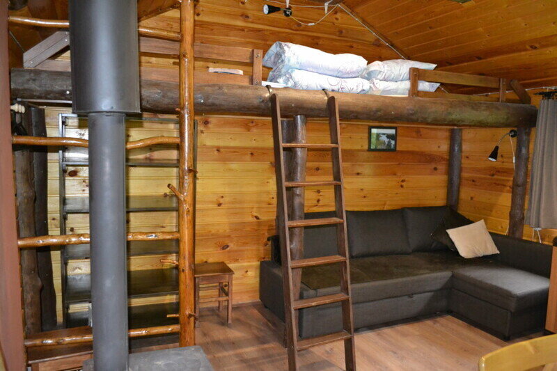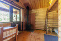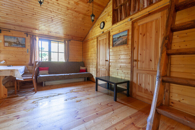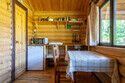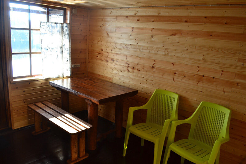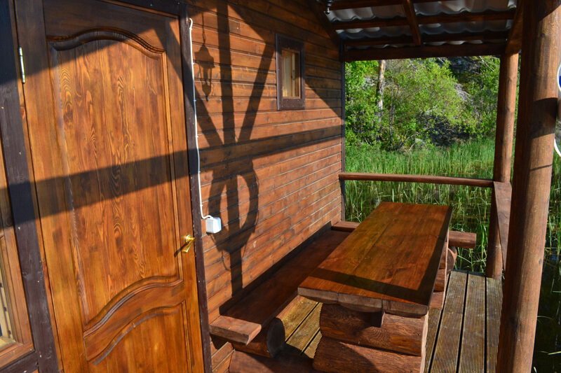 В домике есть: терраса со столом и стульями. В холле находится раскладной диван и над ним двух местная лежанка, обеденный стол, норвежская дровяная печка, кухонная панель с мойкой для посуды. Совмещённый душ и туалет.