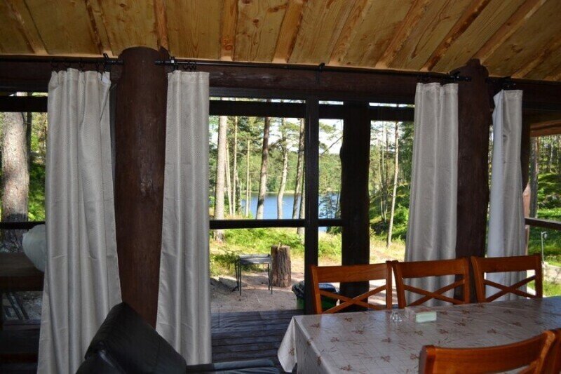 В каждом коттедже есть: терраса со столом и стульями, с террасы видно Ладогу. Телевизор поддерживает функцию чтения видео и музыки с флэшки, кухонная панель с мойкой для посуды.