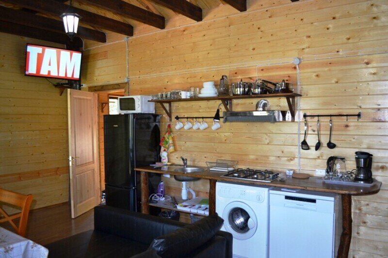 В каждом коттедже есть: терраса со столом и стульями. В холле находится лофт и раскладной диван, обеденный стол, норвежская дровяная печка, кухонная панель с мойкой для посуды. Совмещённый душ и туалет.