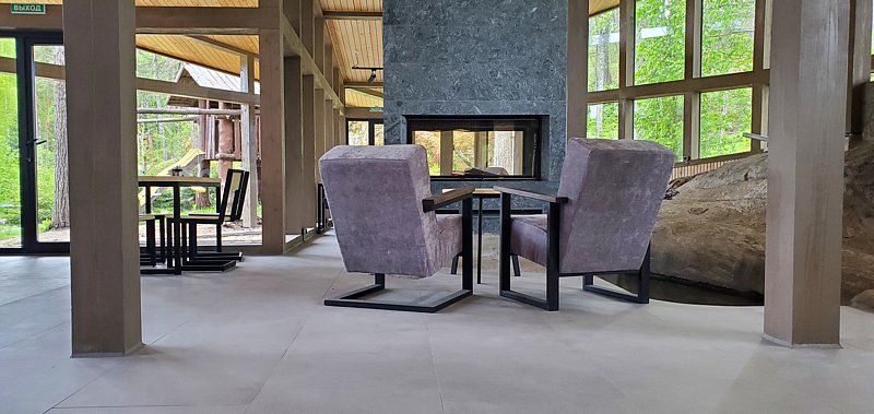 В коттедже есть: терраса со столом и стульями. Терраса с видом на сосновый лес. В холле есть дровяной камин, кресло перед камином, телевизор поддерживающий функцию чтения видео и музыки с флэшки, кухонная панель с мойкой для посуды.