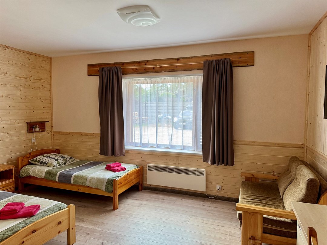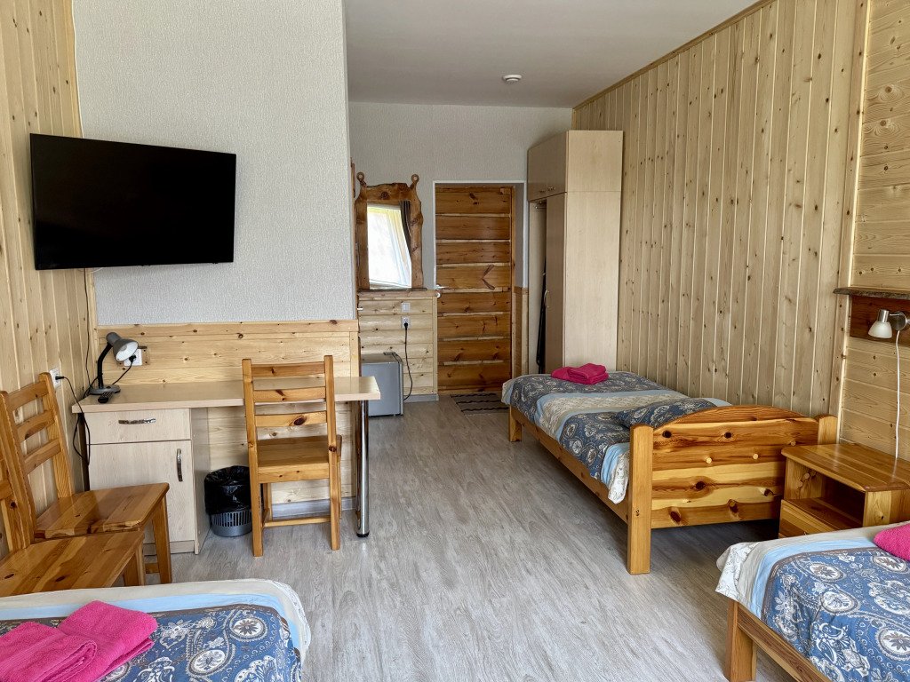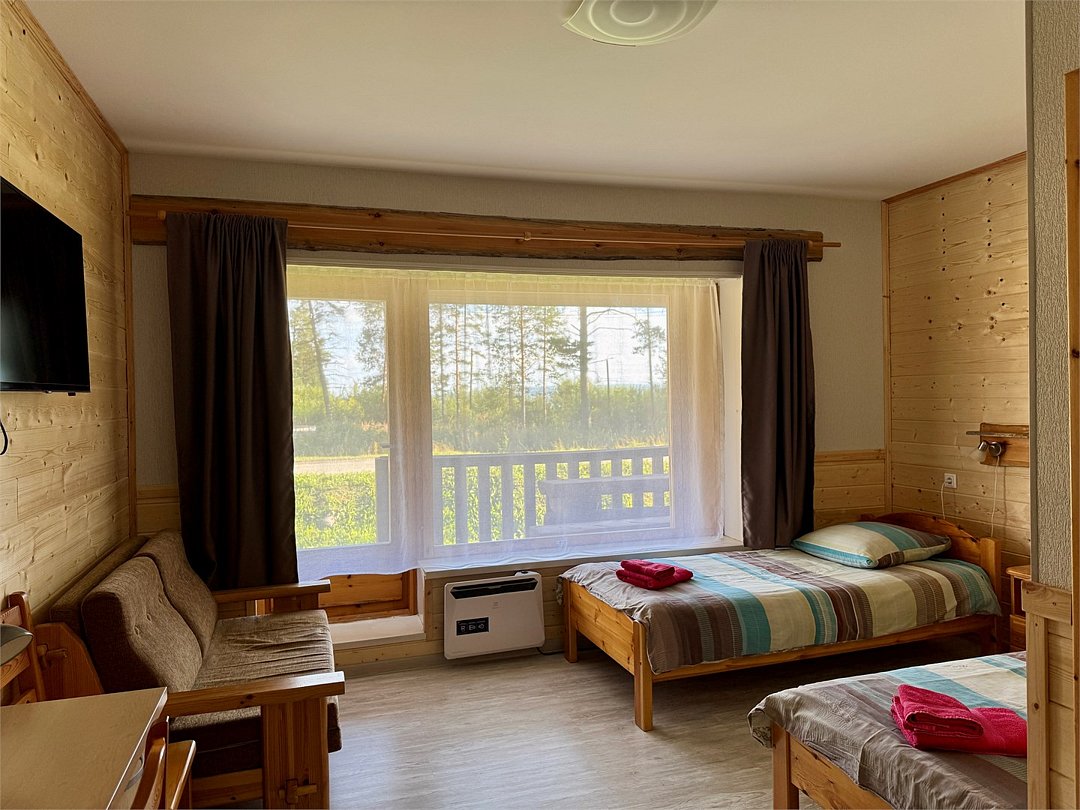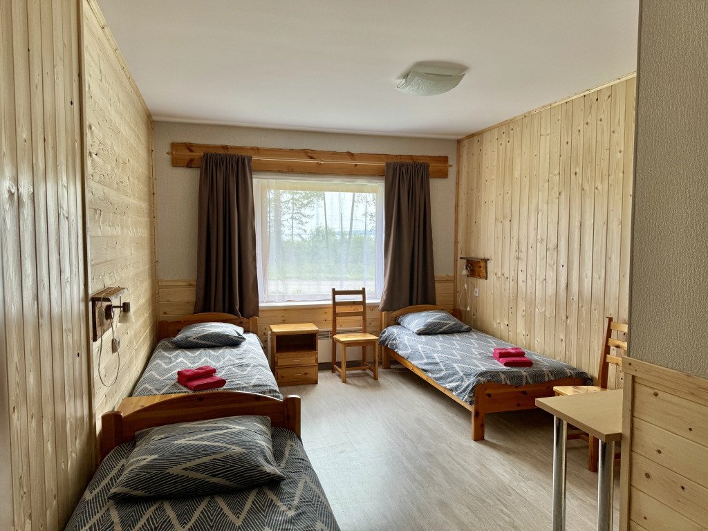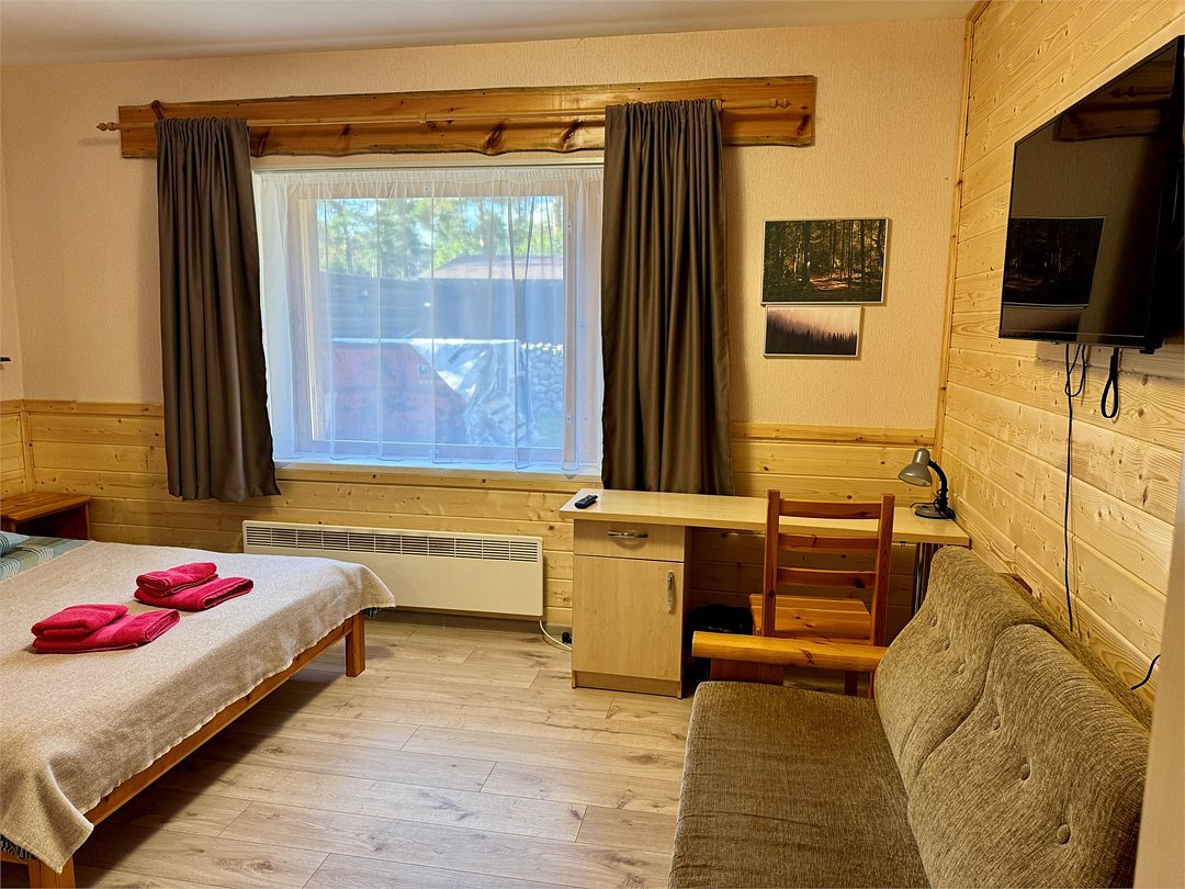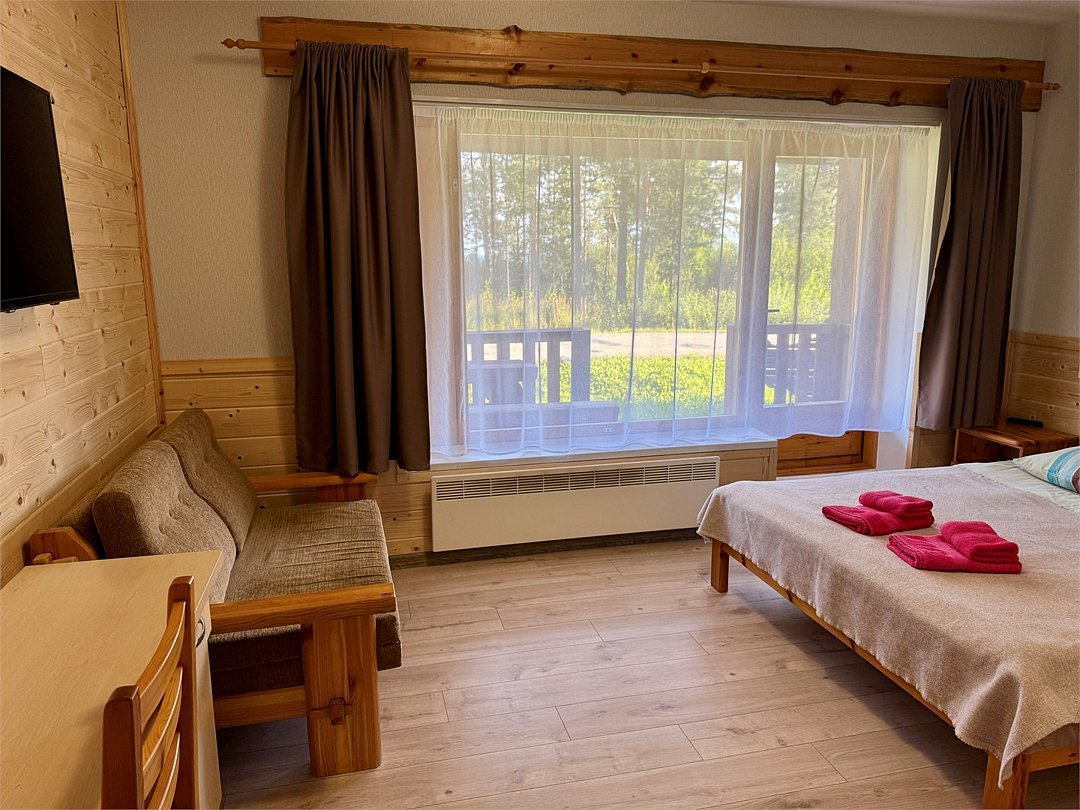 В каждом номере современная стильная мебель из карельской сосны, раскладной диван может использоваться в качестве дополнительного спального места, шкаф для одежды, письменный стол, ТV, санузел, душевая кабина, зеркало, фен, гигиенический душ, финская сантехника, беспроводной интернет Wi-Fi.