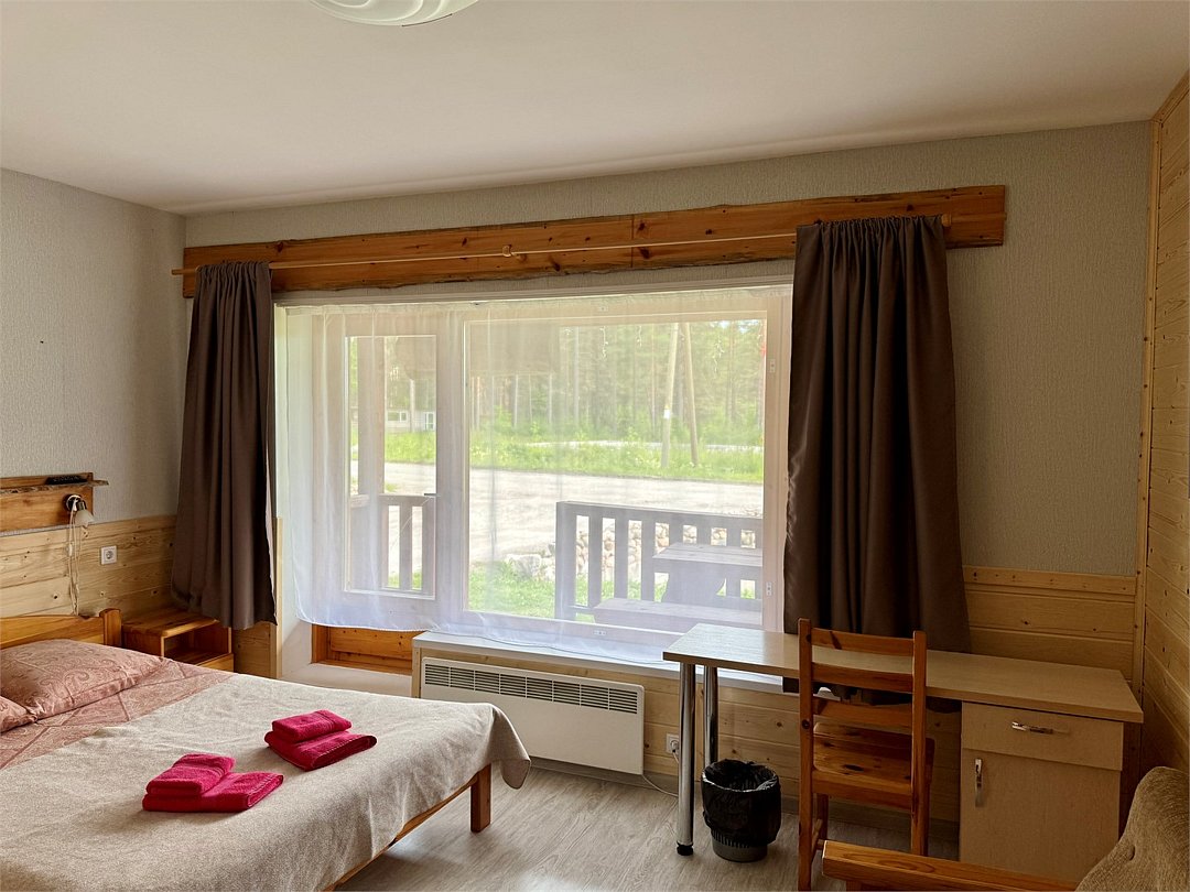 Часть номеров имеет большие панорамные окна и просторный балкон с видом на Онежское озеро.
