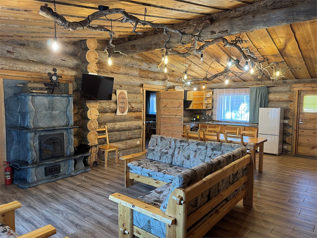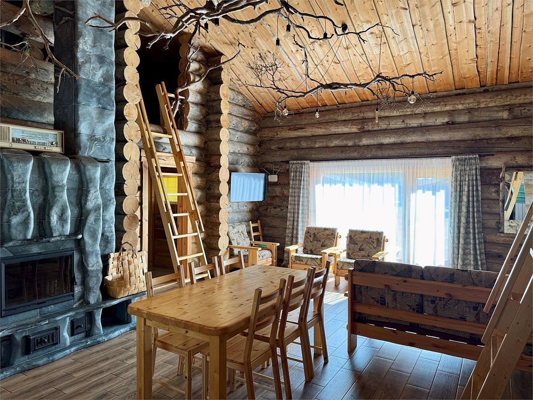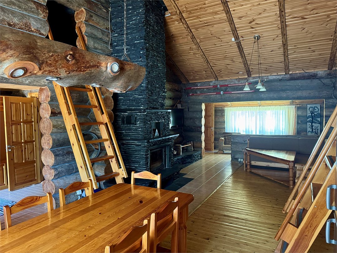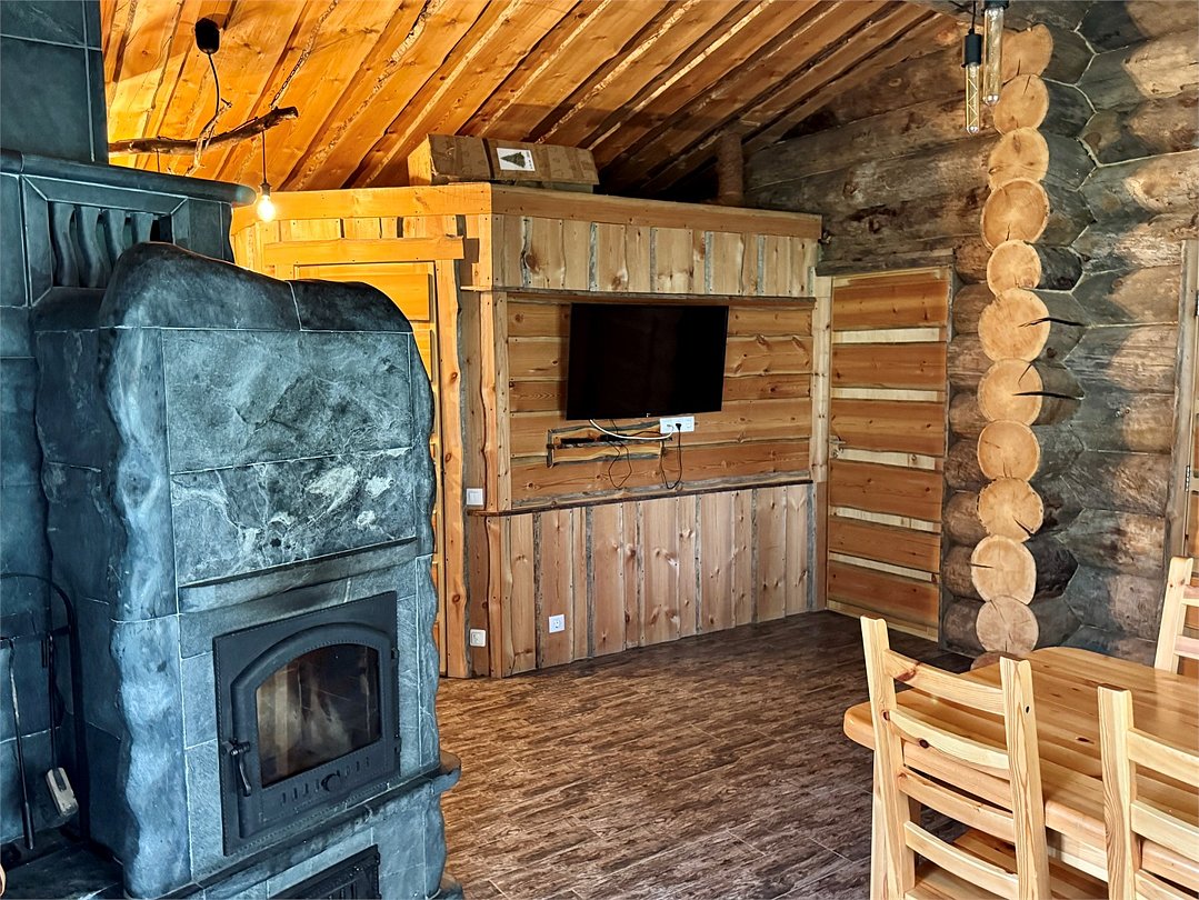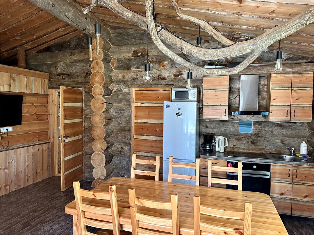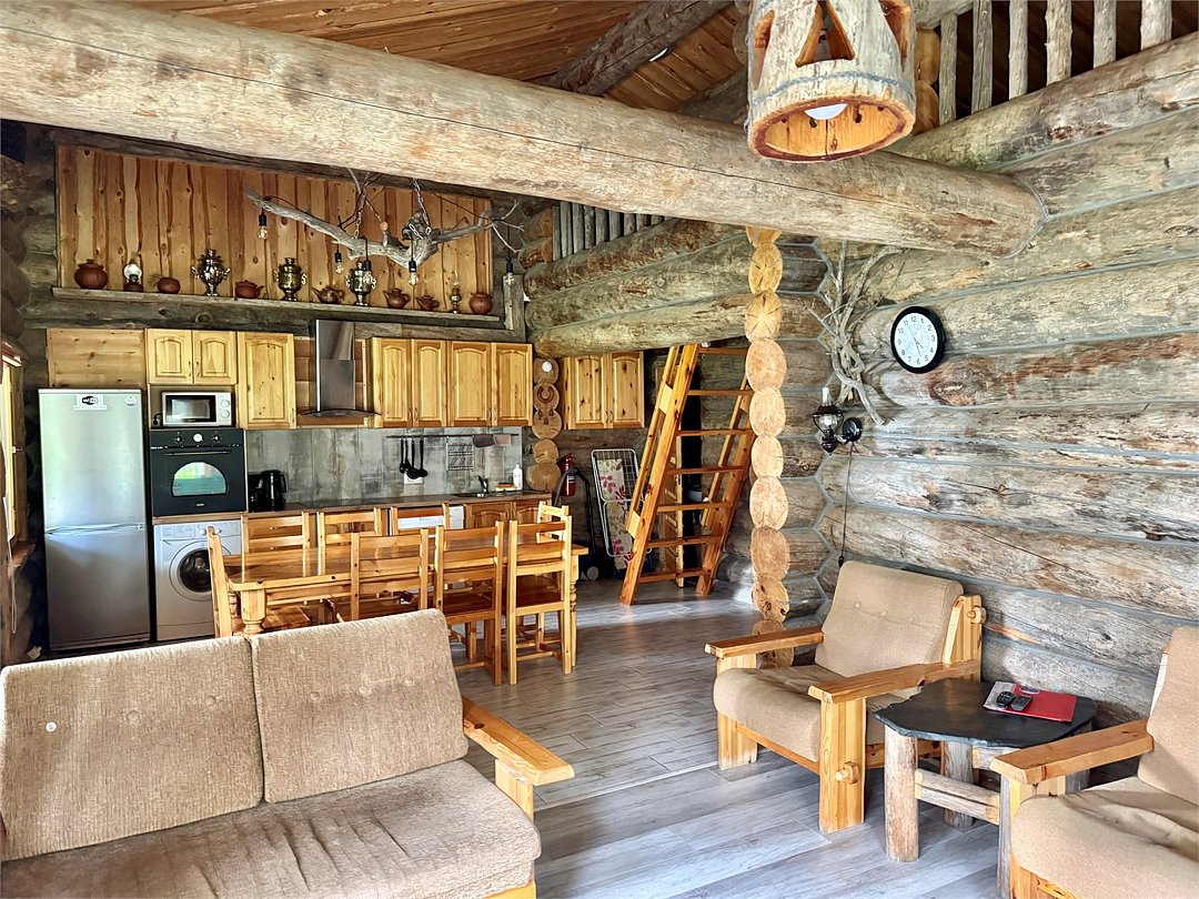 Камин ручной работы, 2 спальни, гостиная совмещенная с кухней со всем необходимым для приготовления пищи, холодильник, ЖК телевизор, сауна, душевая кабина, терраса.