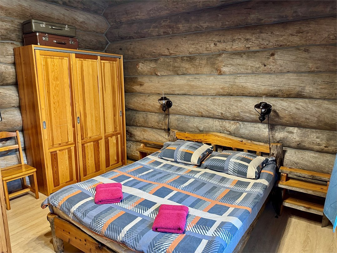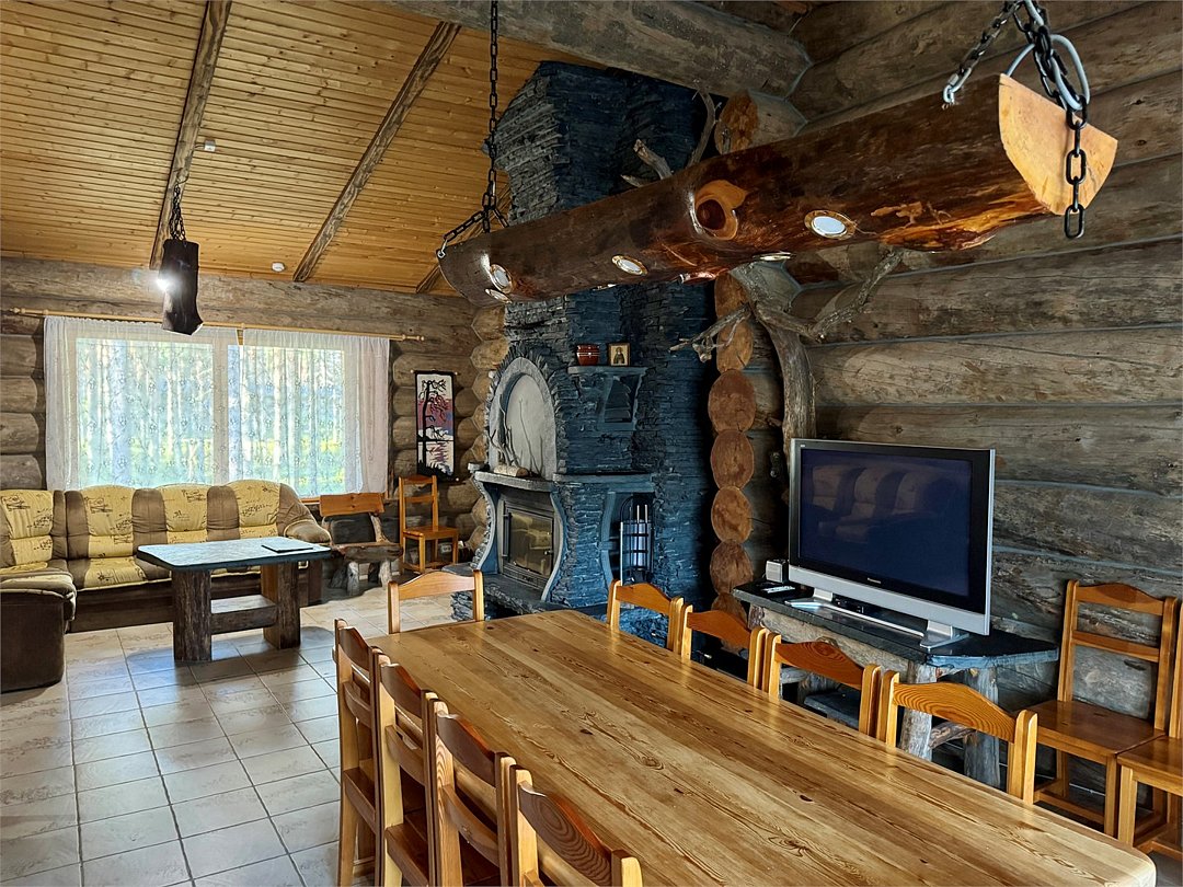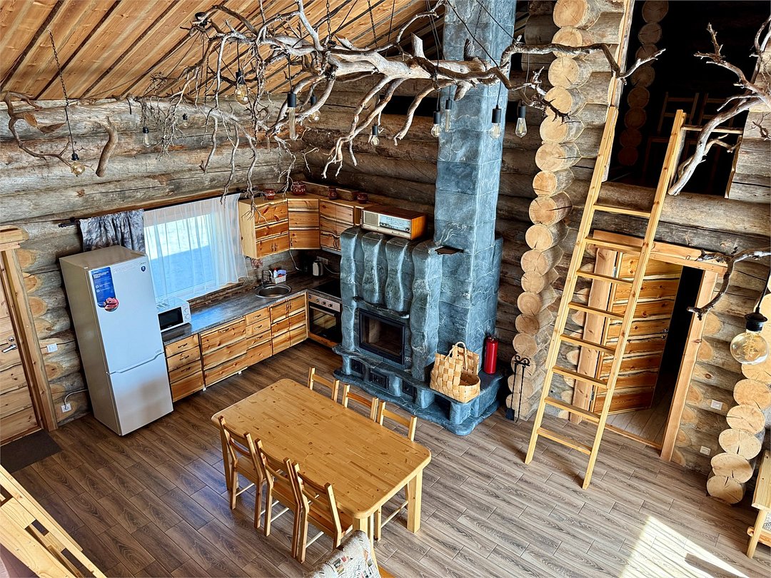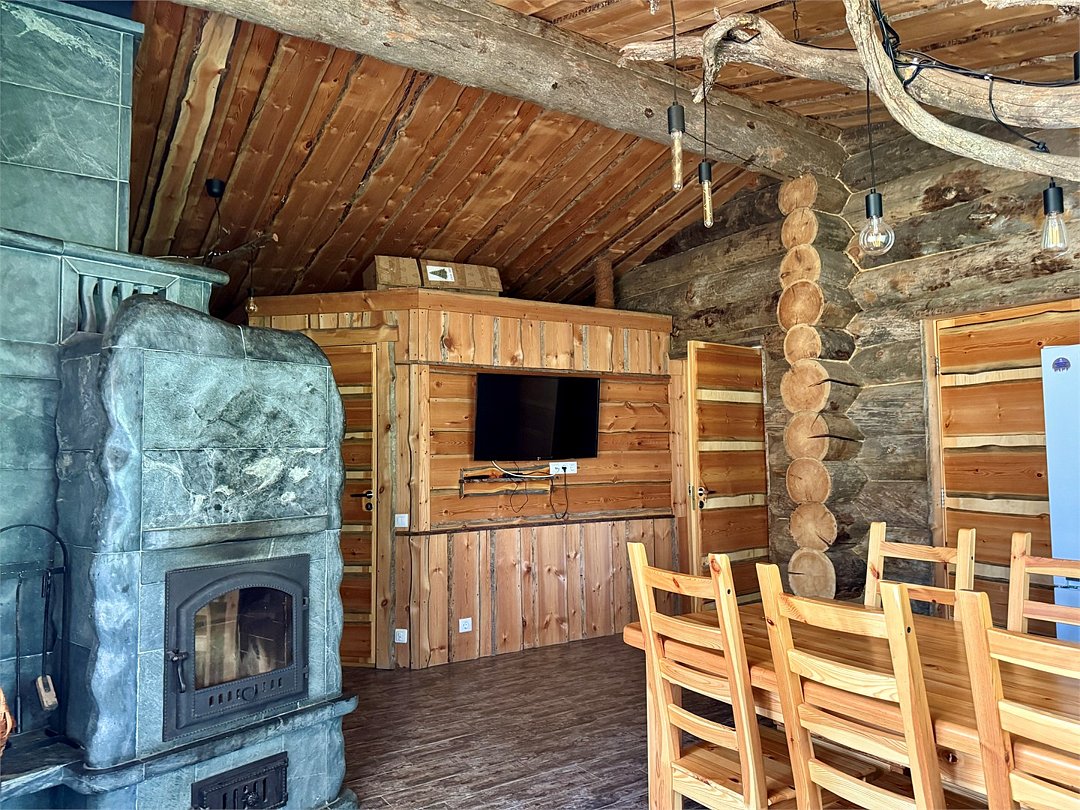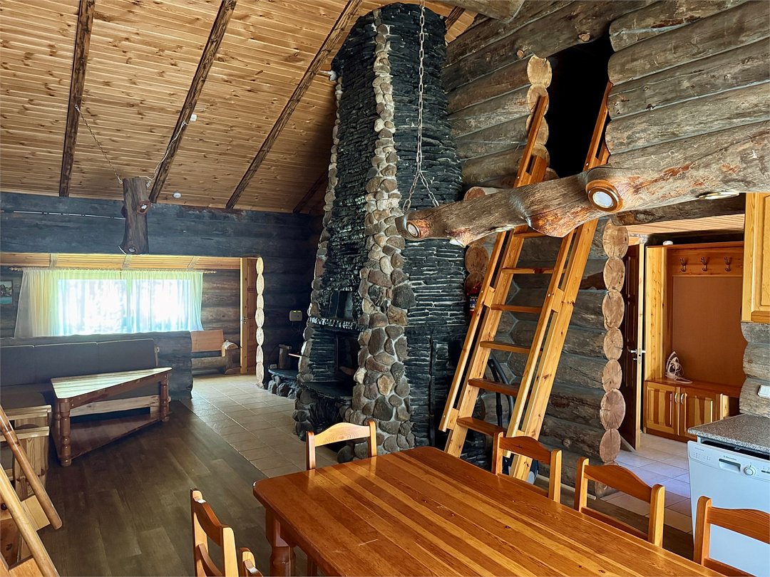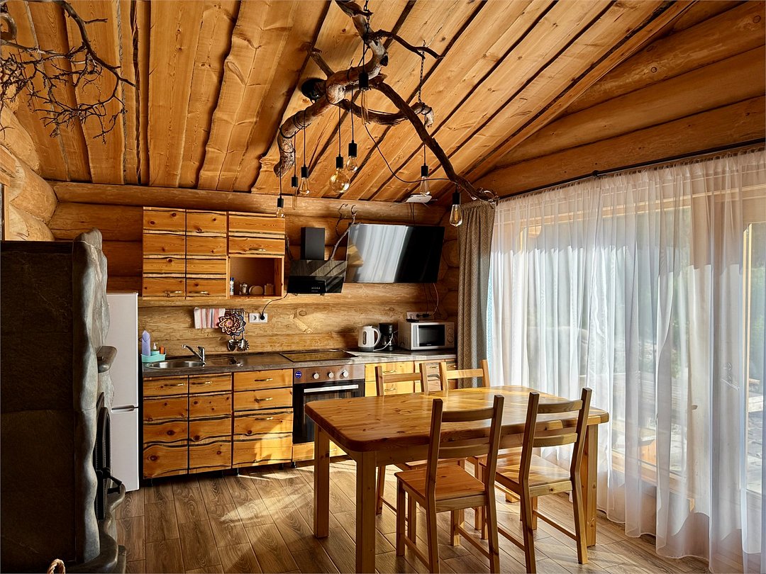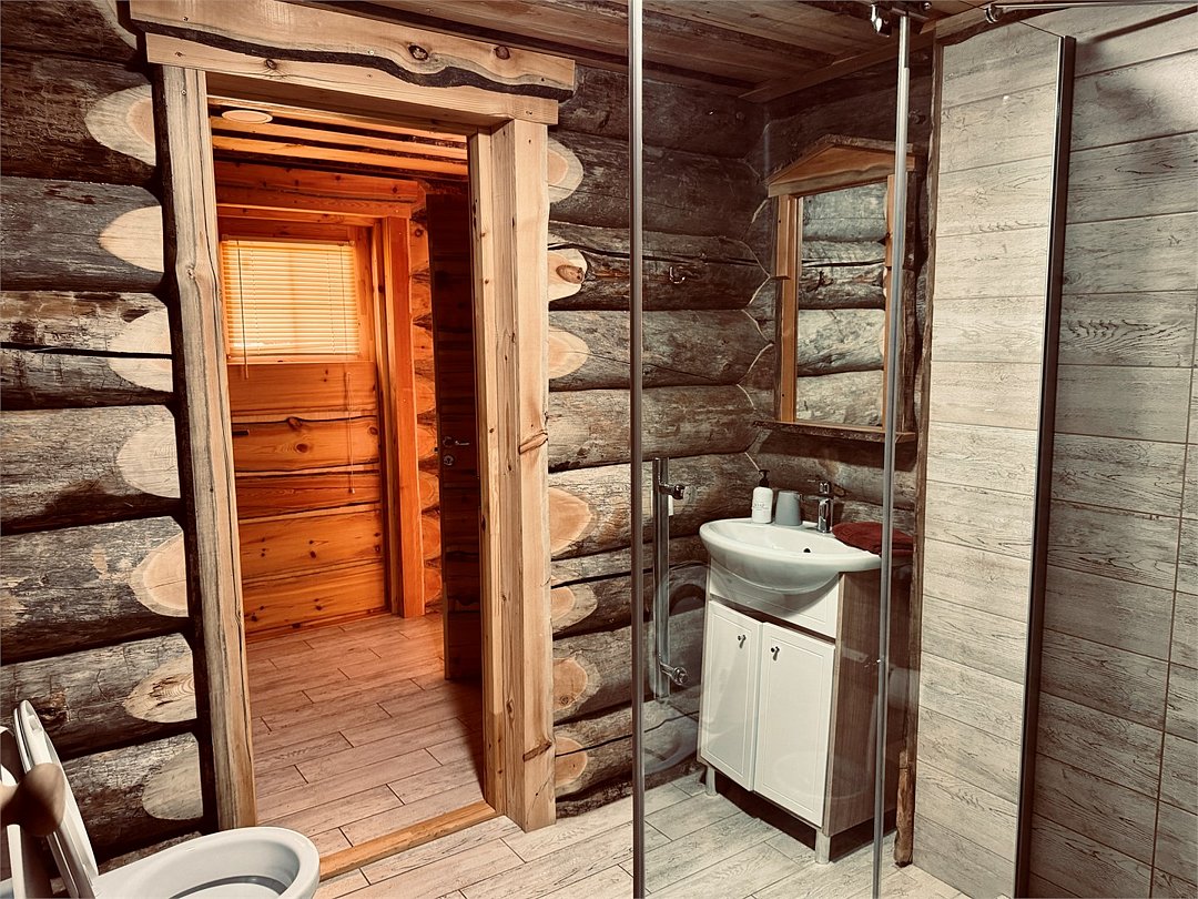 Камин ручной работы, 2 спальни, гостиная совмещенная с кухней со всем необходимым для приготовления пищи, холодильник, ЖК телевизор, сауна, душевая кабина, терраса.