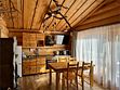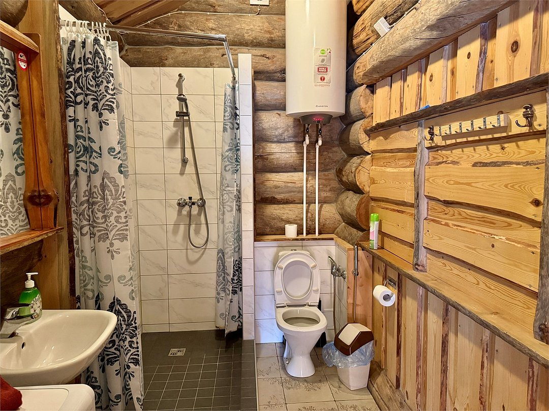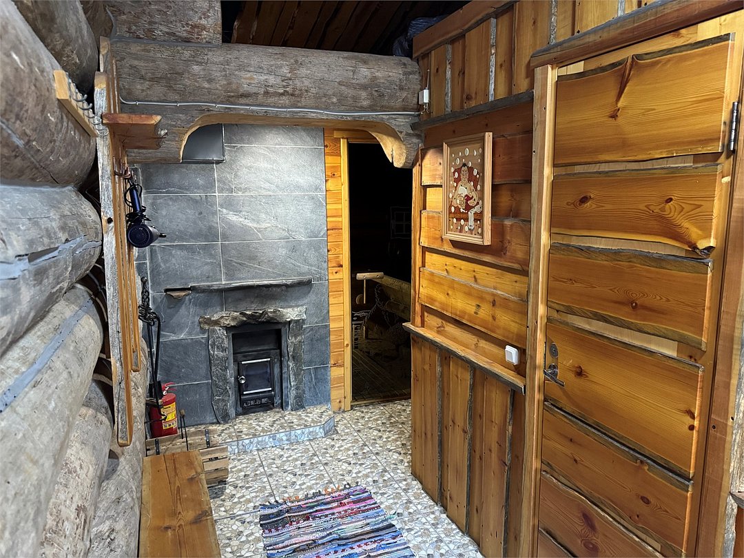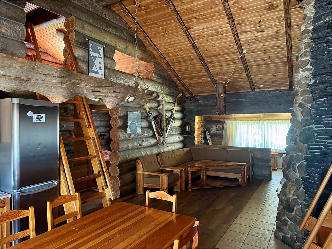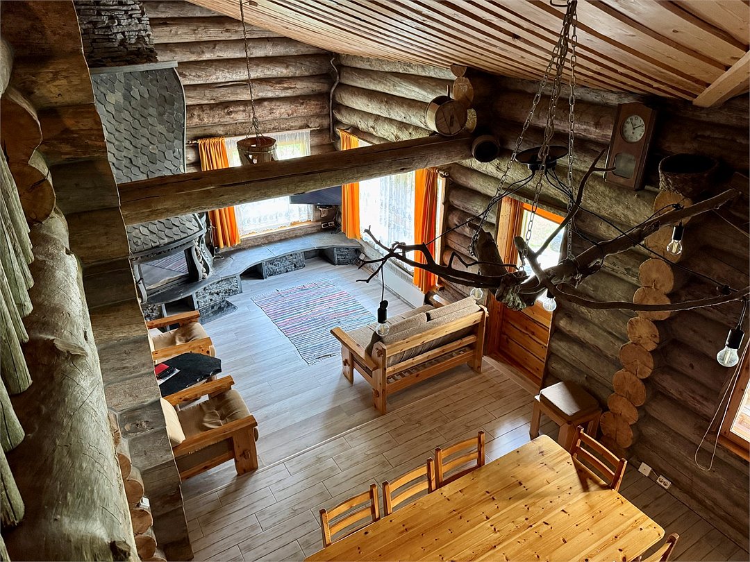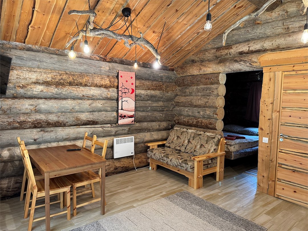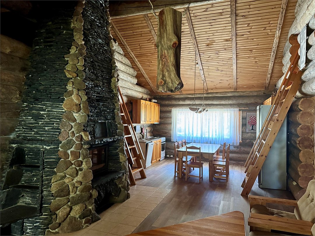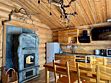 Камин ручной работы, 2 спальни, гостиная совмещенная с кухней со всем необходимым для приготовления пищи, холодильник, ЖК телевизор, сауна, душевая кабина, терраса.