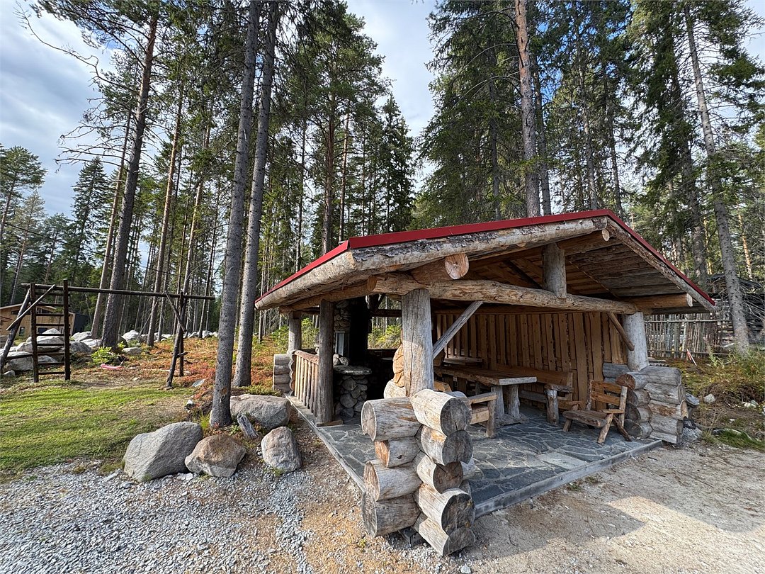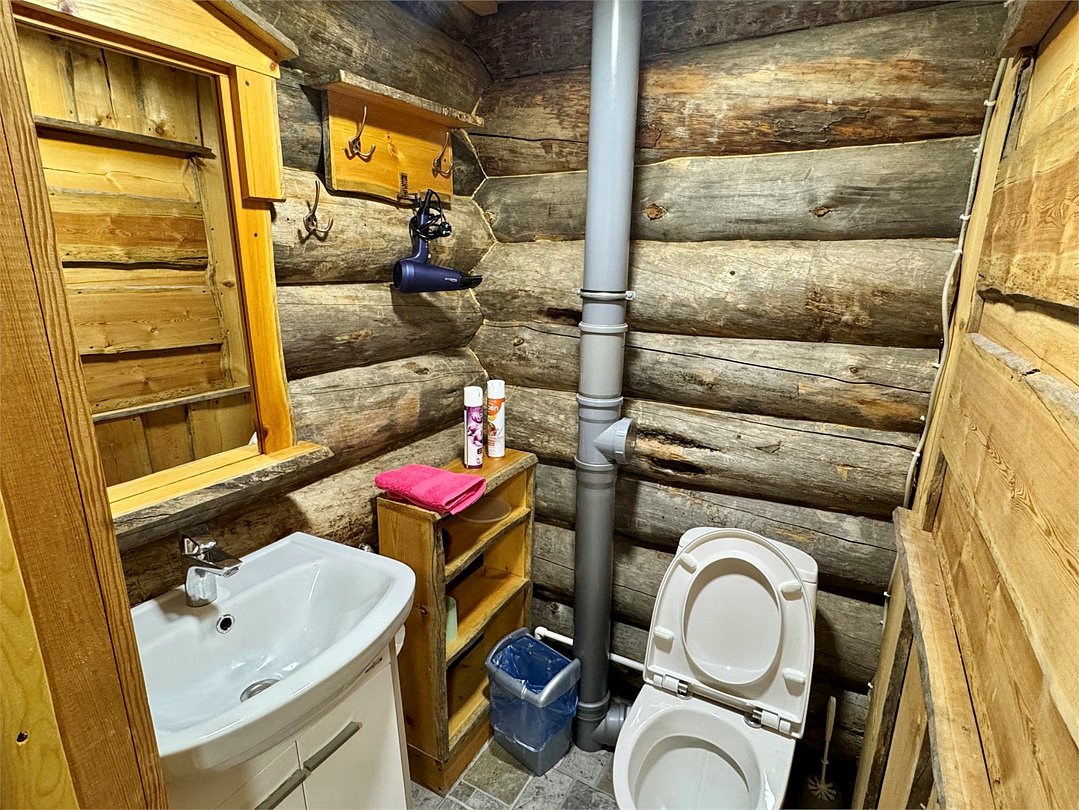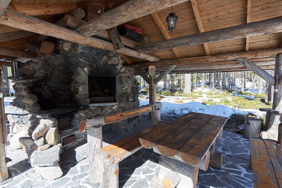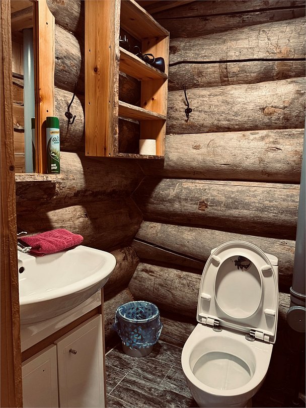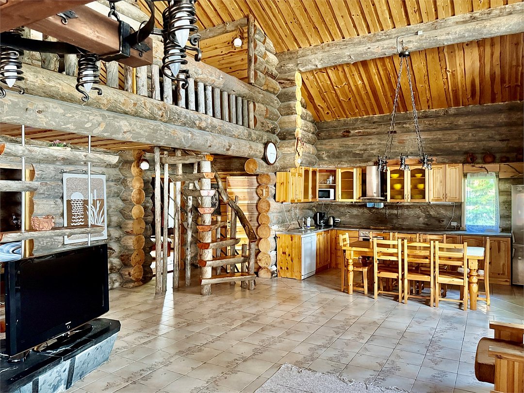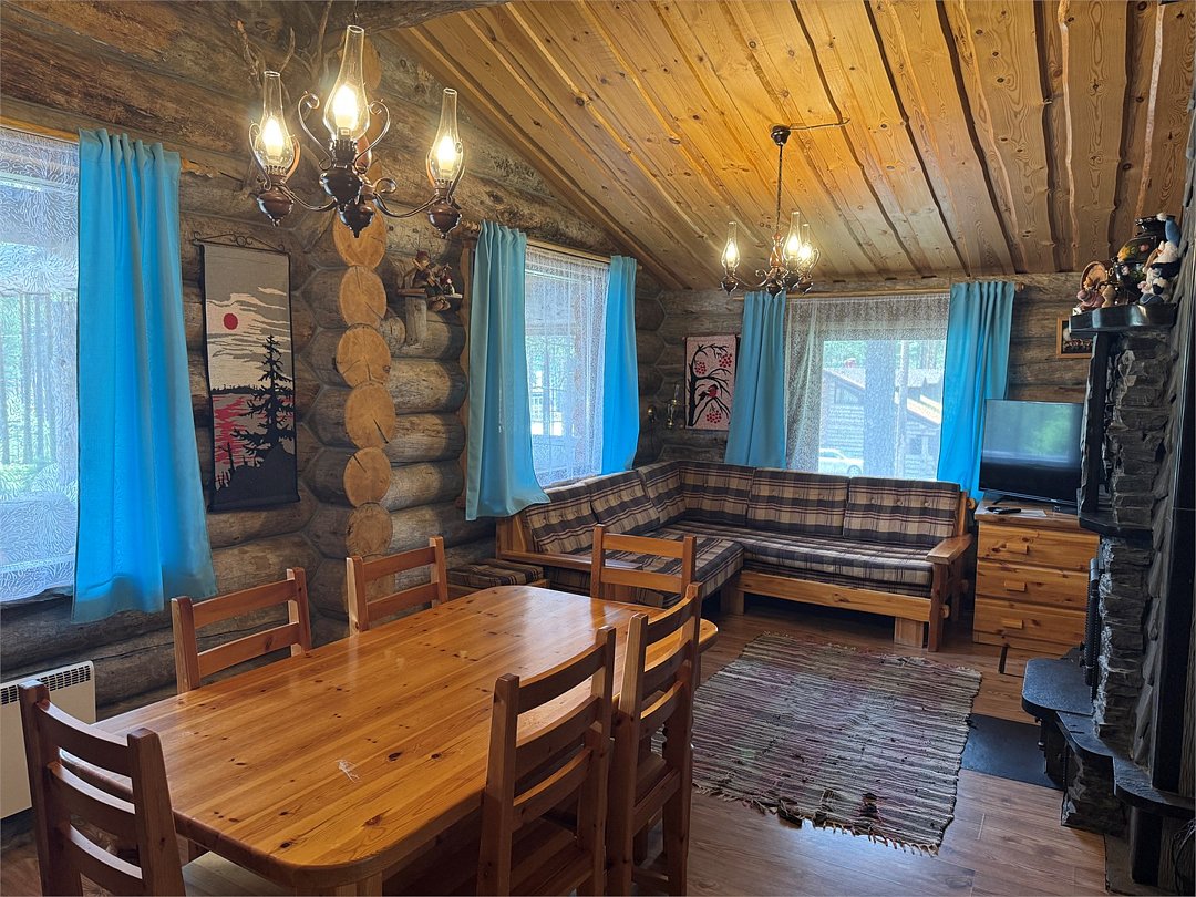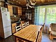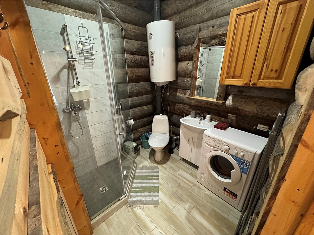 Камин ручной работы, 2 спальни, гостиная совмещенная с кухней со всем необходимым для приготовления пищи, холодильник, ЖК телевизор, сауна, душевая кабина, терраса.