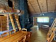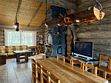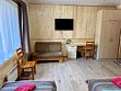 Уютная холл-гостиная 50 м2, где есть три стола 3х4, кухонный гарнитур, два мягких трехместных дивана, журнальный столик (вся мебель из натуральной сосны) посуда, электрочайник, микроволновая печь, стиральная машина, холодильник, телевизор 43", цифровое ТВ.