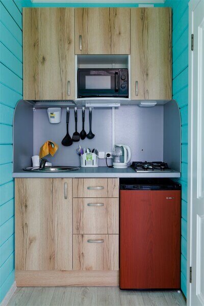 Комфортный номер с тремя отдельными односпальными кроватями. В корпусе гостиницы располагается отдельная кухня столовая со всем необходимым для приготовления и приёма пищи с видом на озеро.