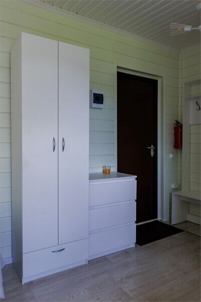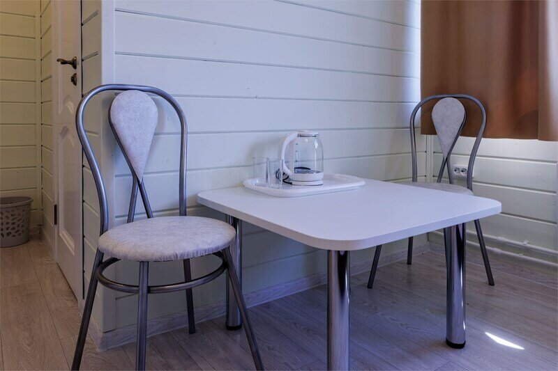 Комфортный номер с двуспальной кроватью и отдельной односпальной. В корпусе гостиницы располагается отдельная кухня столовая со всем необходимым для приготовления и приёма пищи с видом на озеро.
