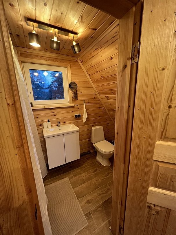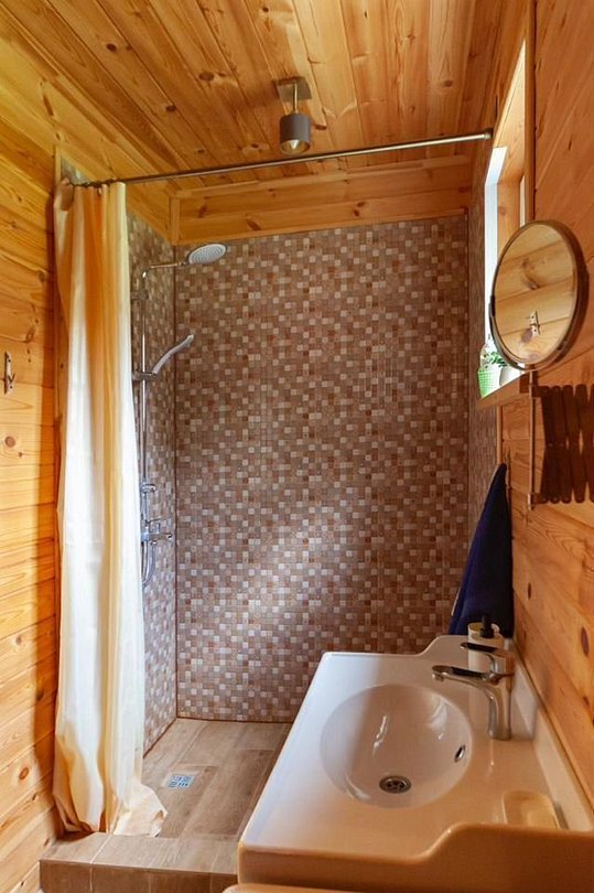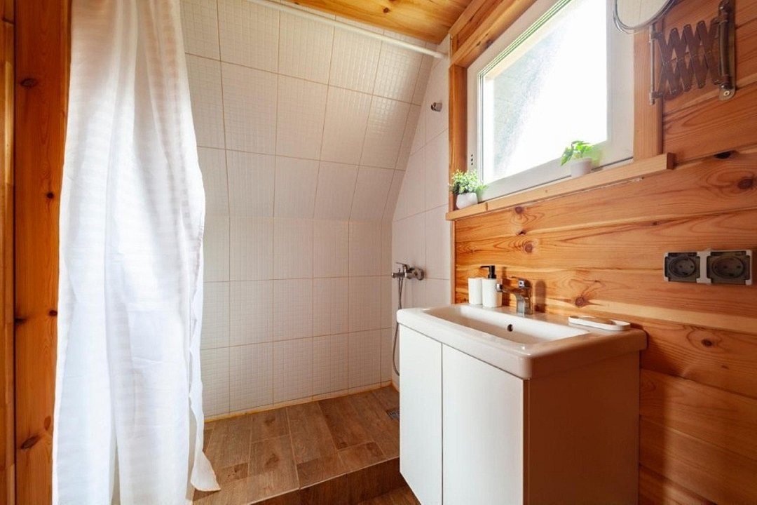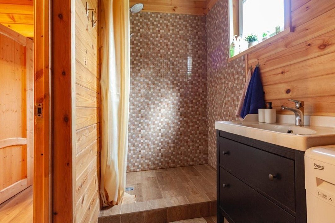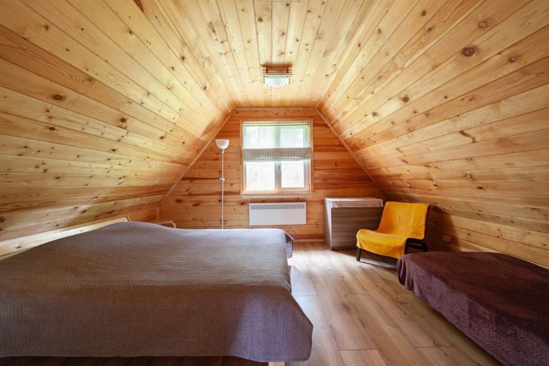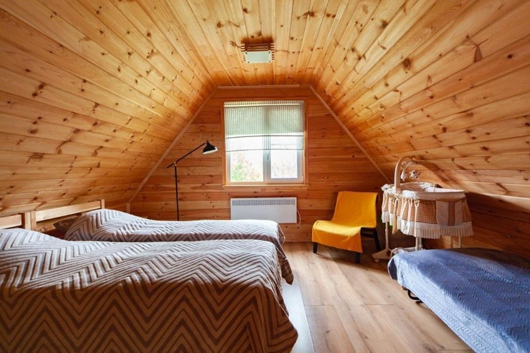 Сам дом вмещает до тринадцати человек. Первый этаж: две комнаты и гостиная-кухня. Второй этаж: две комнаты и холл с диваном. Открытая терраса и беседка на улице перед домом для семейного ужина, приятного чаепития или чего-нибудь покрепче сделают ваш отдых ещё уютнее. Шезлонги и качели.