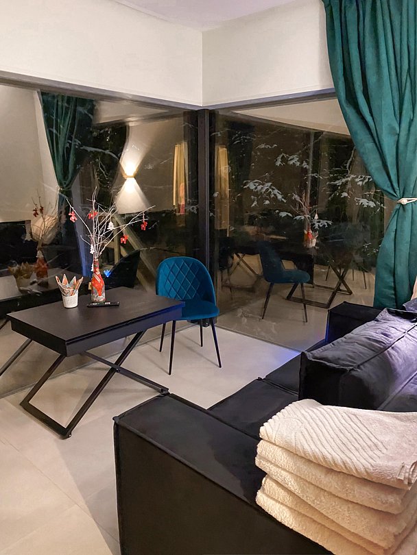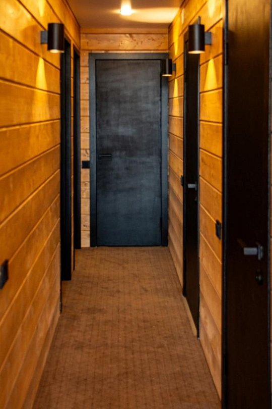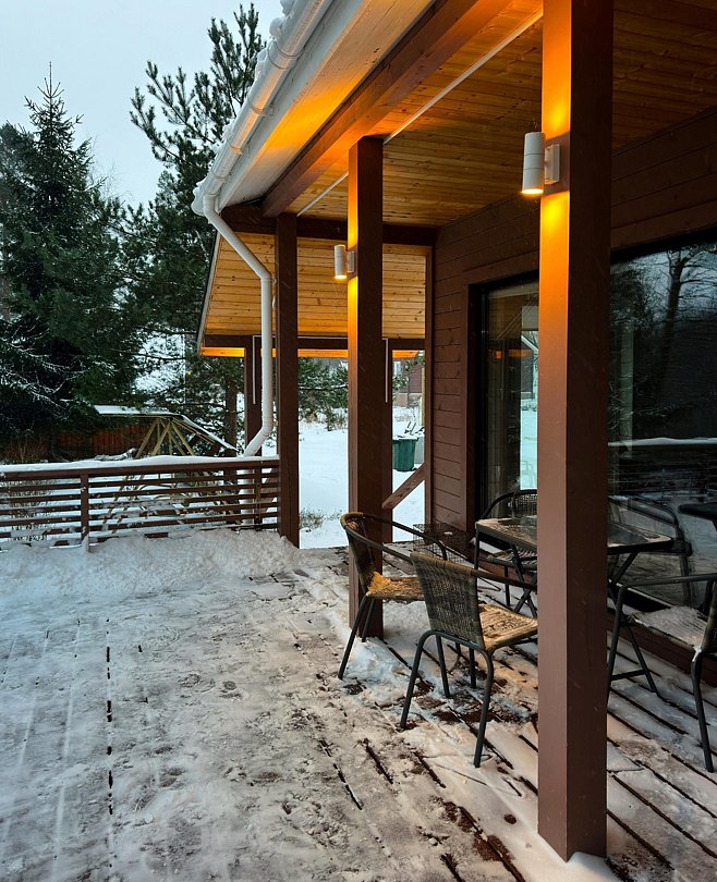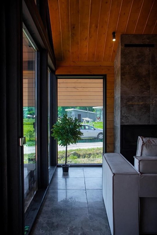 Дом (105 м²): две спальни с двуспальными кроватями со своими санузлами, большая гостиная. Дом оборудован: камином, сауной на дровах, банным чаном, большой террасой, Wi-Fi, мангальной зоной.