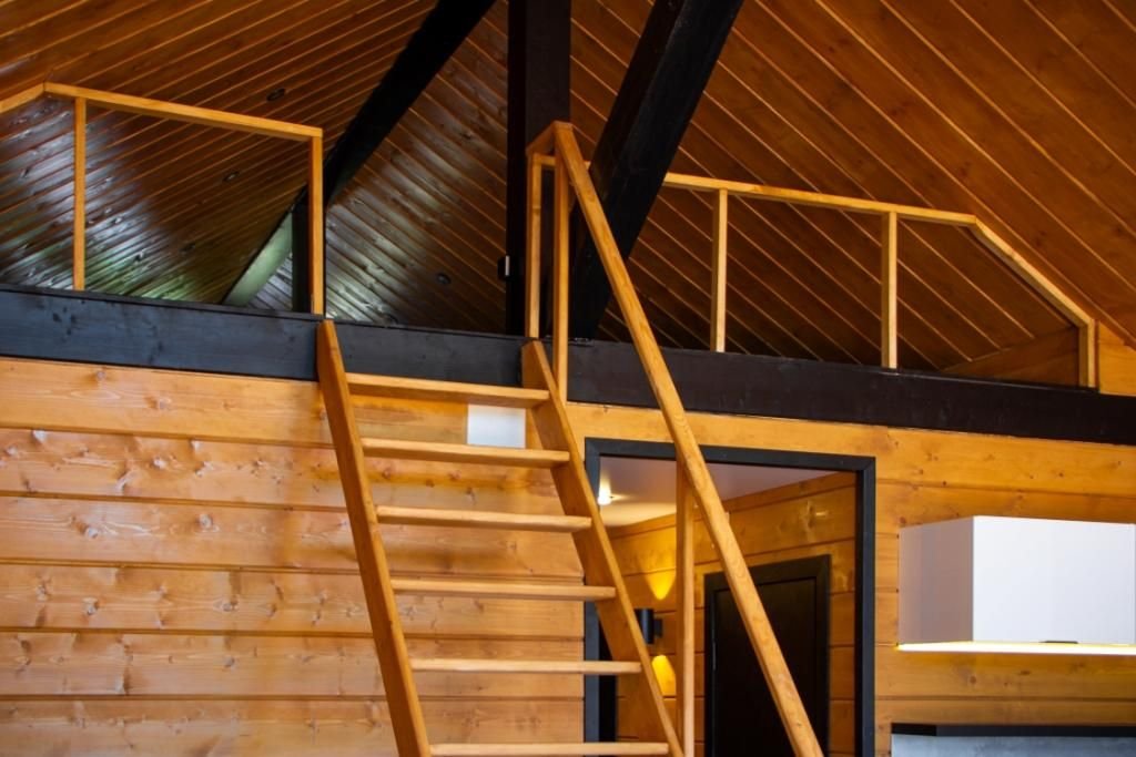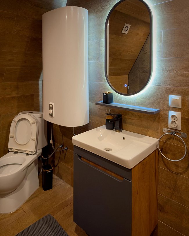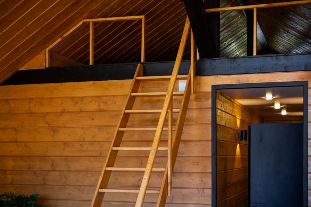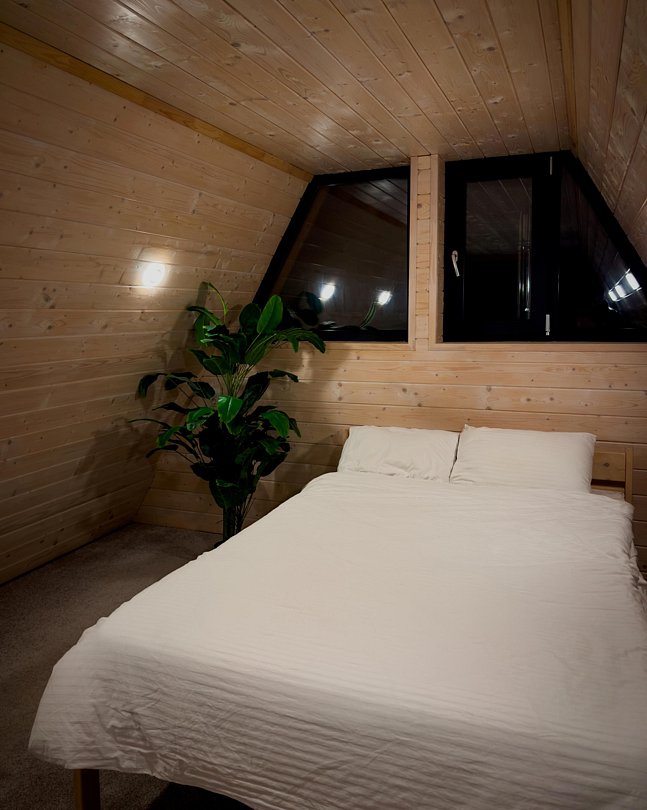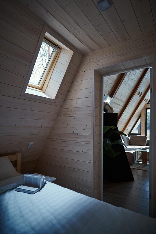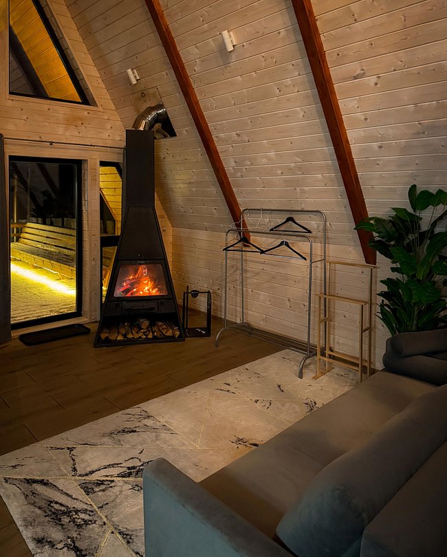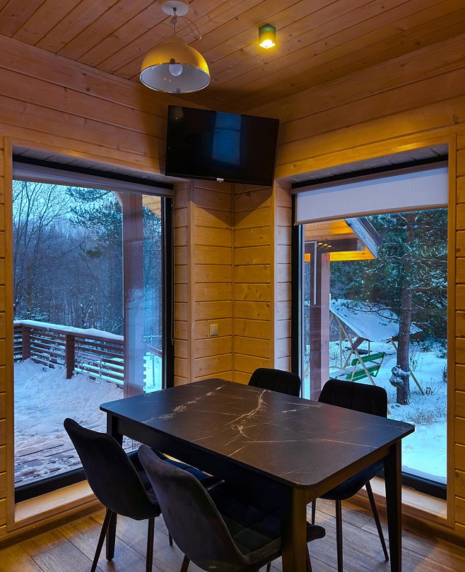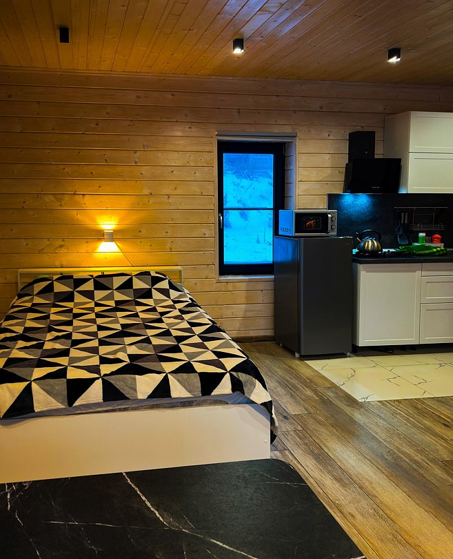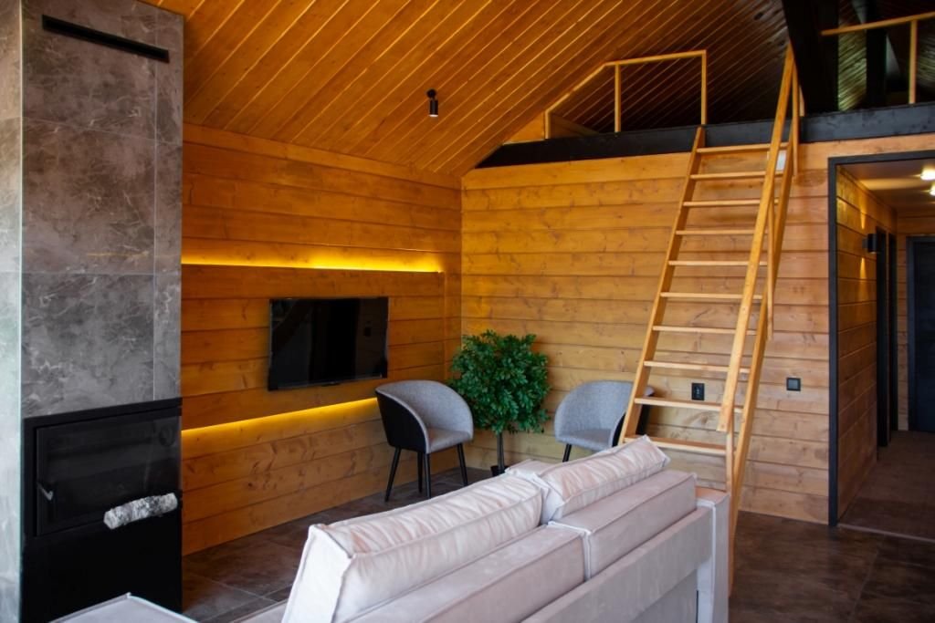 Дом (105 м²): две спальни, верхняя открытая спальня (мансарда), большая гостиная. Домик оборудован камином, сауной на дровах, банным чаном, большой террасой, Wi-Fi, мангальной зоной.
