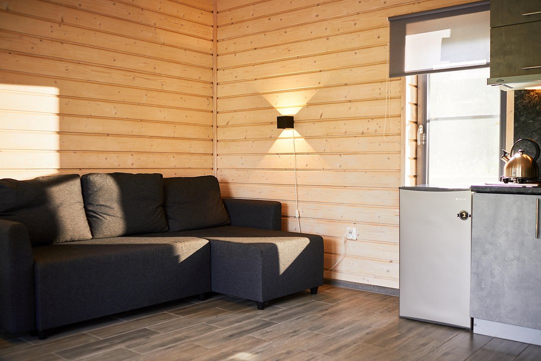 Домик (тридцать квадратных метров): Большая гостиная. Домик оборудован сауной на дровах, банным чаном, небольшой террасой, Wi-fi, мангальной зоной.