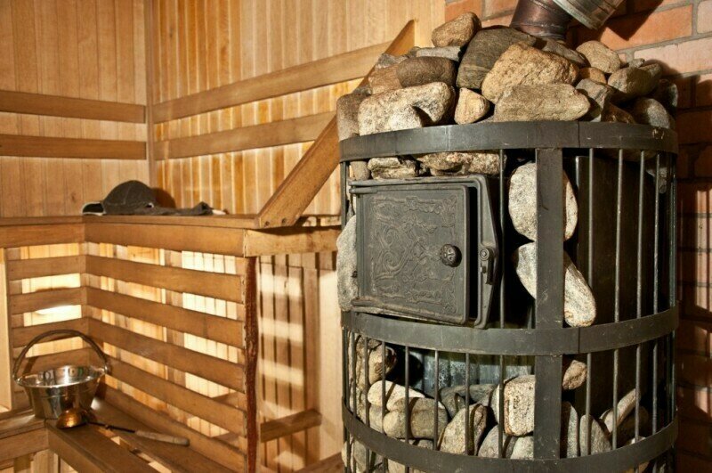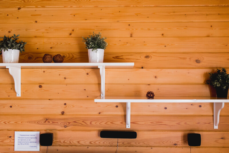 - прихожая, кухня, спальня с двуспальной и детской кроватями, гостиная, санузел, душевая с сауной (дровяная и электрическая), крытая терраса с печью-барбекю.