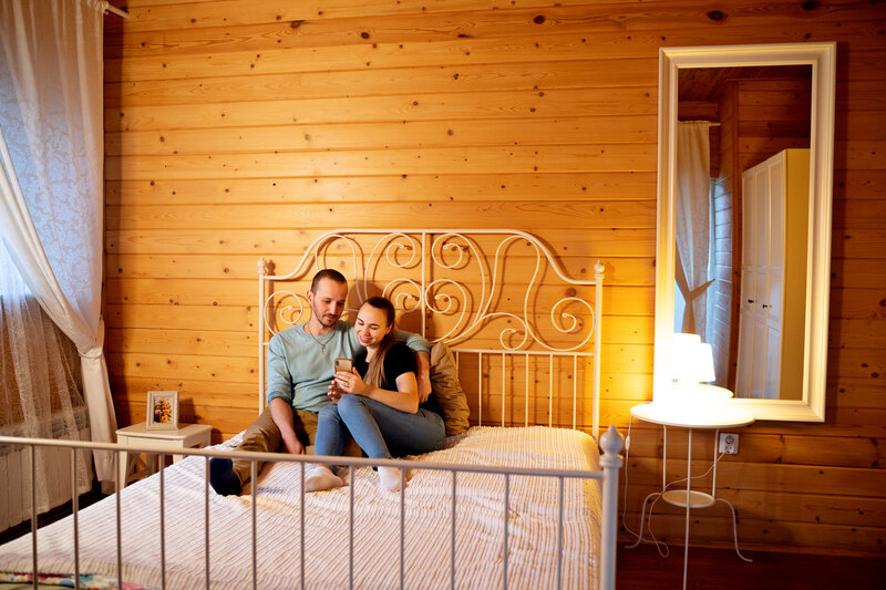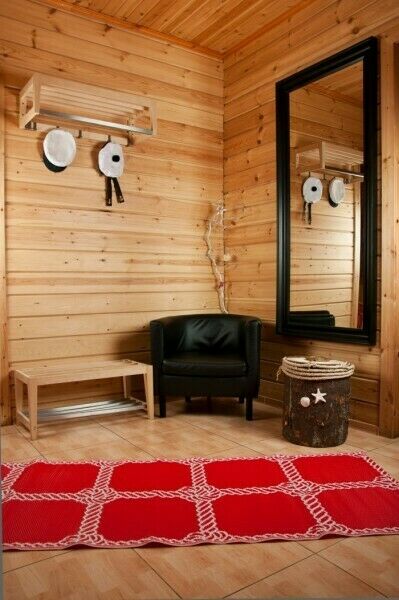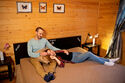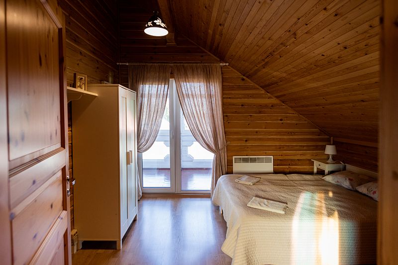 На первом этаже также расположены просторный холл, туалетная комната и сауна, а на втором этаже — спальные комнаты. В первой спальне вы найдете двуспальную кровать для родителей и детскую кроватку для малыша, во второй смогут устроиться сразу пять человек, третья спальня — это детский уголок с двухъярусной кроватью и четвертая спальня предназначена для четверых человек.