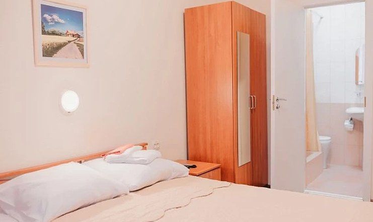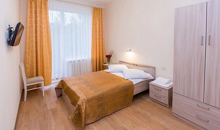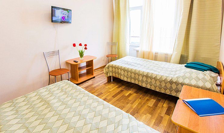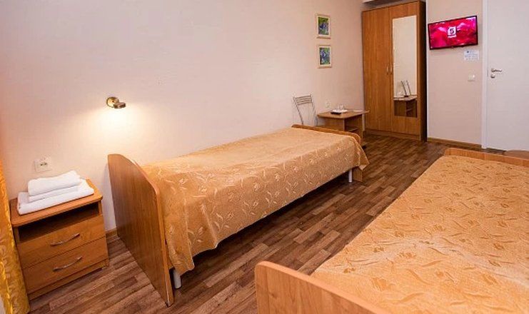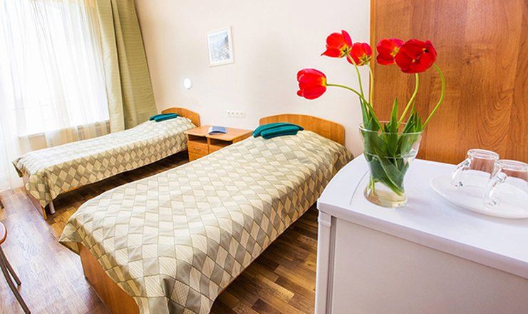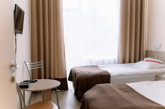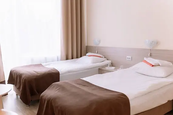 Отдельный двухместный однокомнатный номер с прихожей площадью от 13 до 18 м2. В номере две односпальные кровати, прикроватные тумбы, телевизор, холодильник, журнальный столик, два кресла/стула, платяной шкаф, балкон, санузел (душ, унитаз, умывальник). Номера отремонтированы в 2018-2021 годах с полной заменой сантехники, мебели, окон. В номере может разместиться от 1 до 3 человек (дополнительное место: раскладушка).