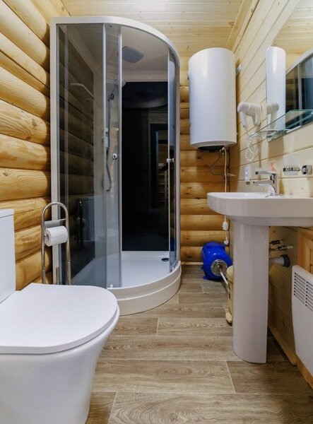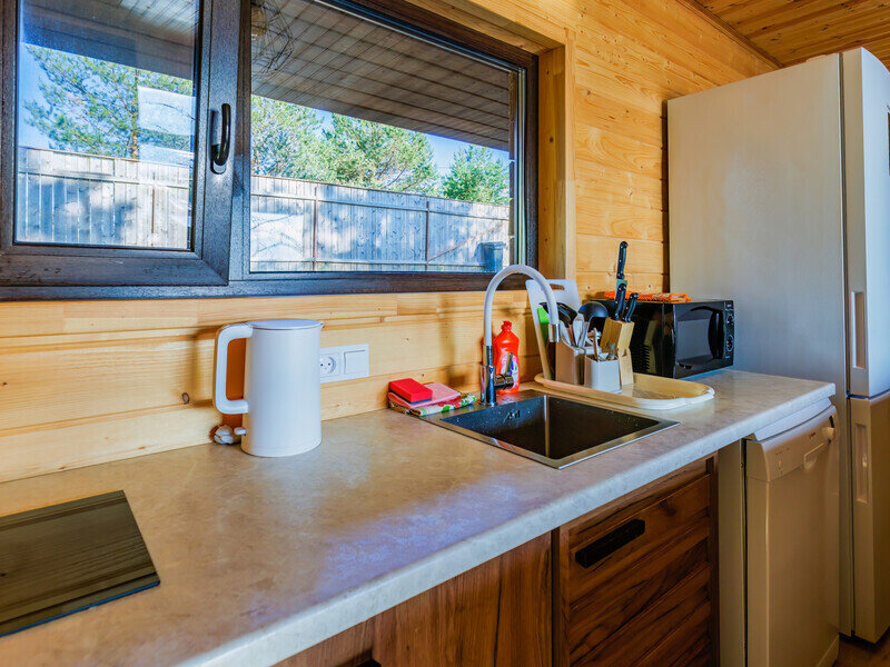Дом с удобствами, спальня + гостиная, в гостиной диван + кухня, душ, туалет.