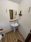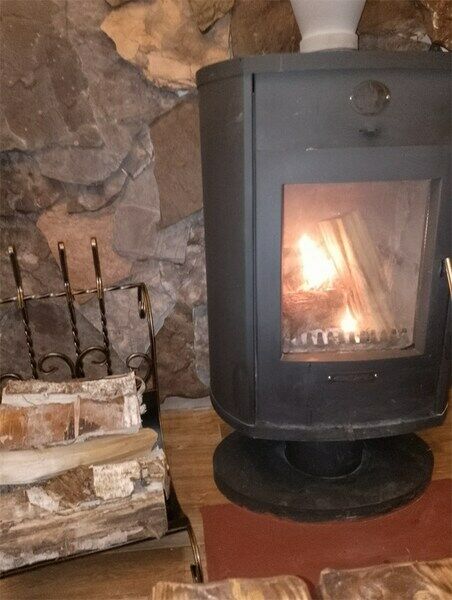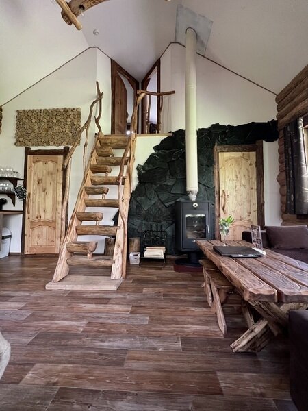 Первый этаж представляет собой просторную студию, в которой есть : кухня-гостиная со всем необходимым: печь-камин, варочная панель, посуда, столовые приборы, микроволновка, электро-чайник, холодильник, обеденный стол ручной работы, угловой диван-кровать. Сан-узел: душевая кабина, раковина с умывальником, унитаз.