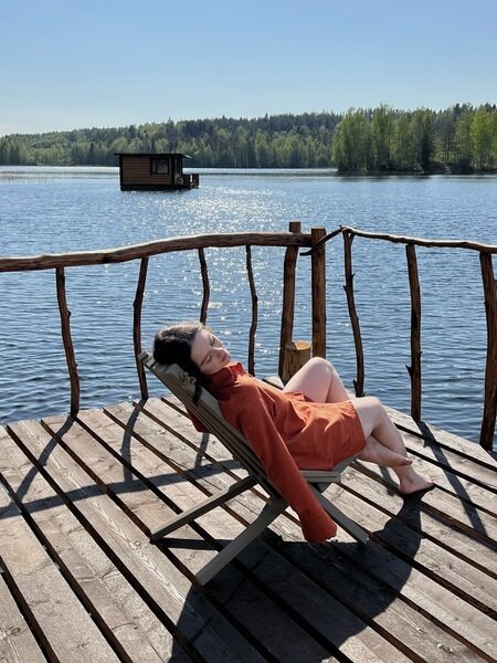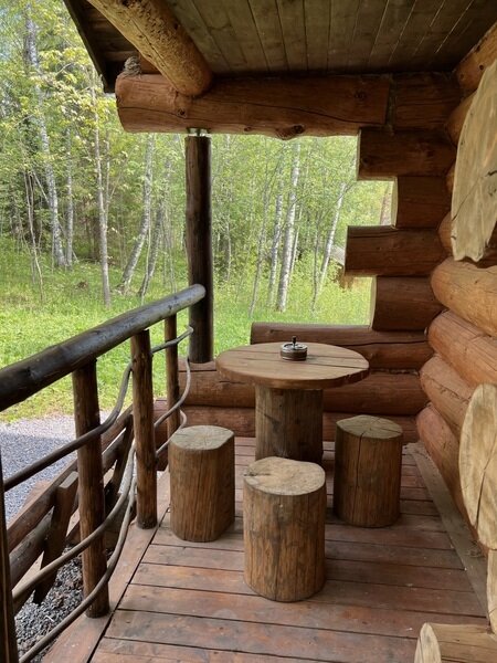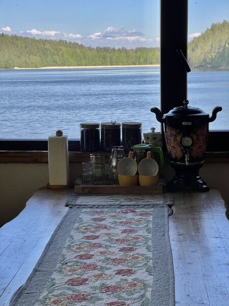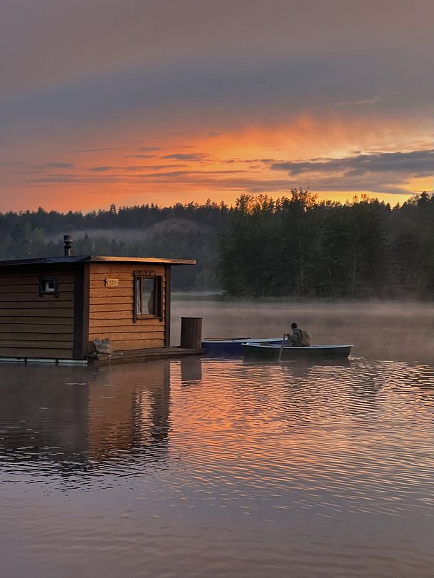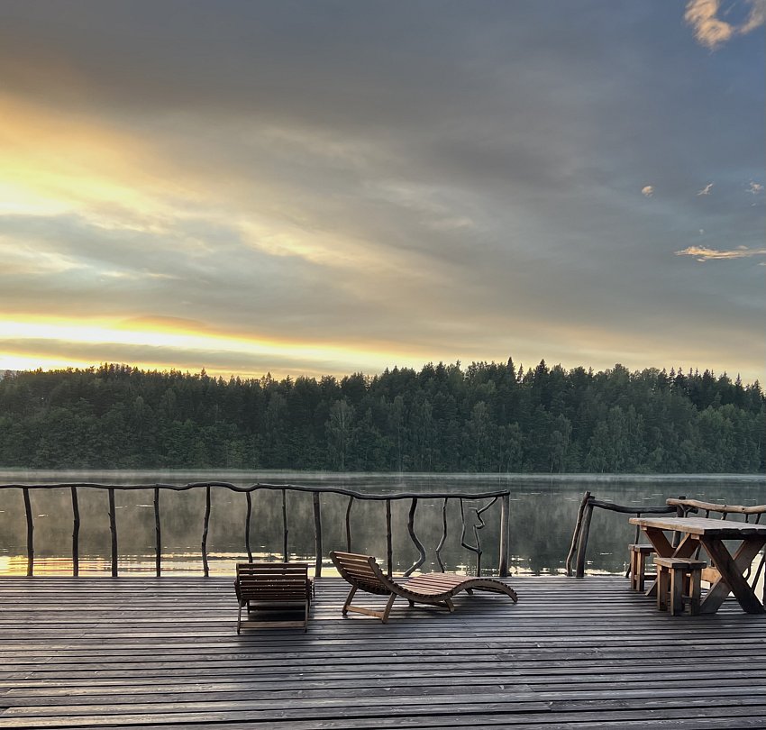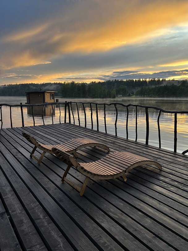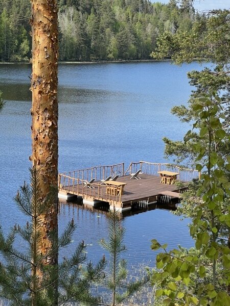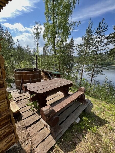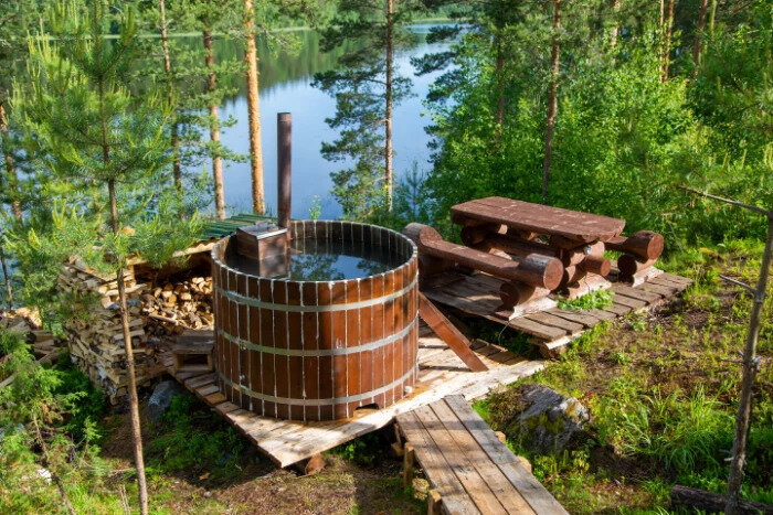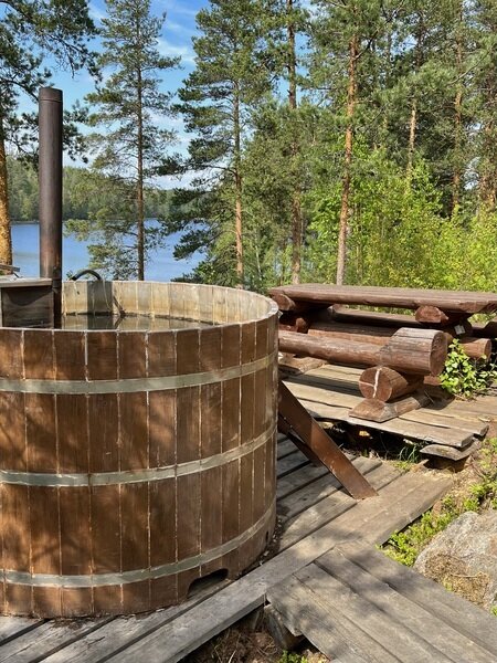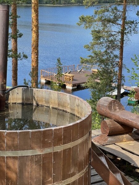 Купель находится в отдалении от коттеджей с видом на лес и озеро, что помогает созерцать природу в полном расслаблении, нежась в тёплой воде.
