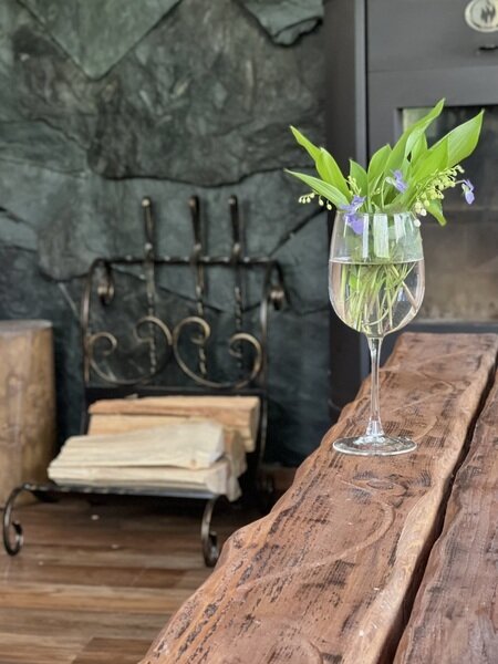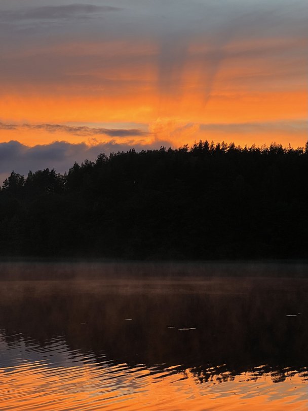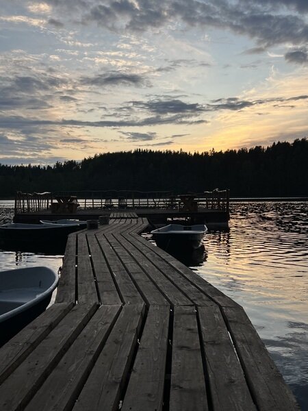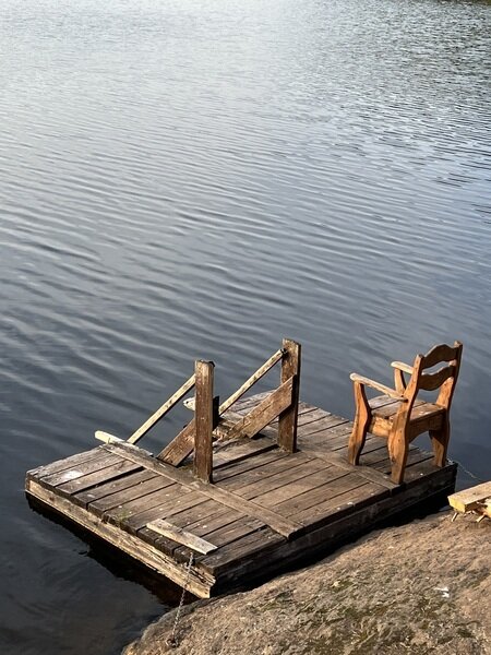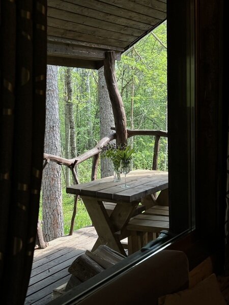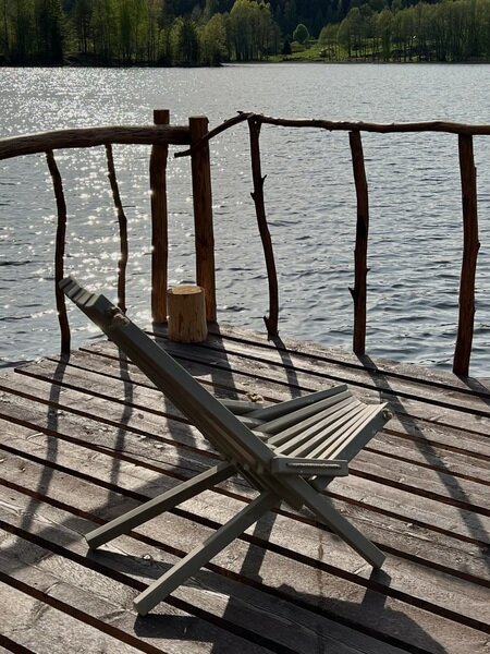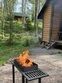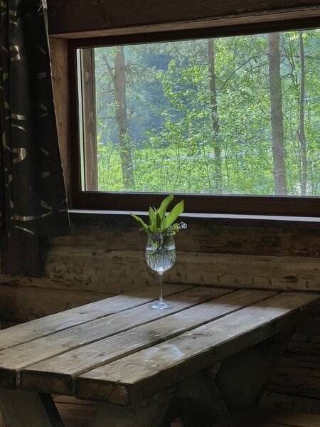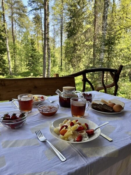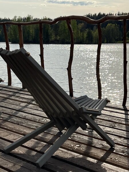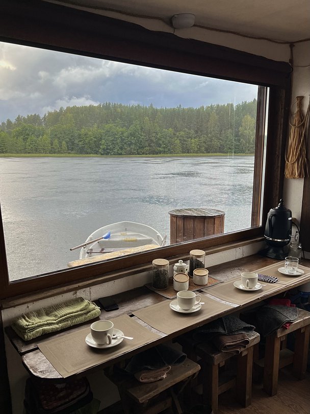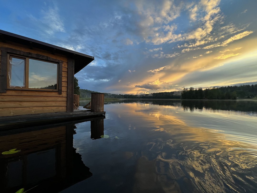 Купель находится в отдалении от коттеджей с видом на лес и озеро, что помогает созерцать природу в полном расслаблении, нежась в тёплой воде.