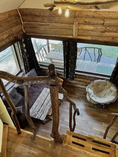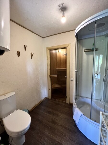 На первом этаже расположена отдельная спальня с двуспальной кроватью, кухня-гостиная со всем необходимым: печь-камин, варочная панель, посуда, столовые приборы, микроволновка, электро-чайник, холодильник, обеденный стол ручной работы, угловой диван-кровать. Сан-узел: электро-сауна, душевая кабина, раковина с умывальником, унитаз.