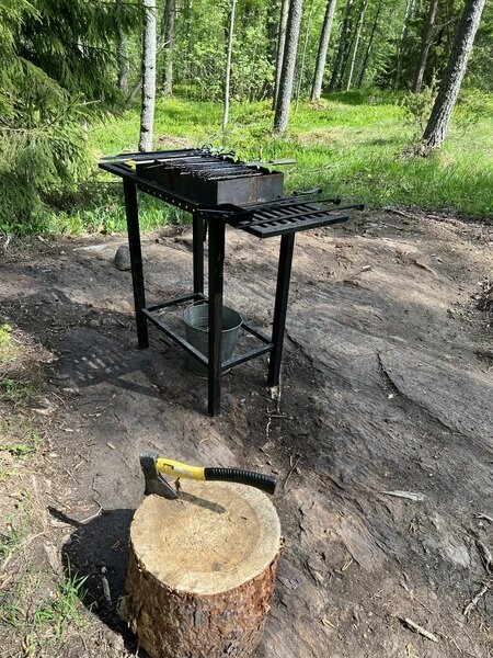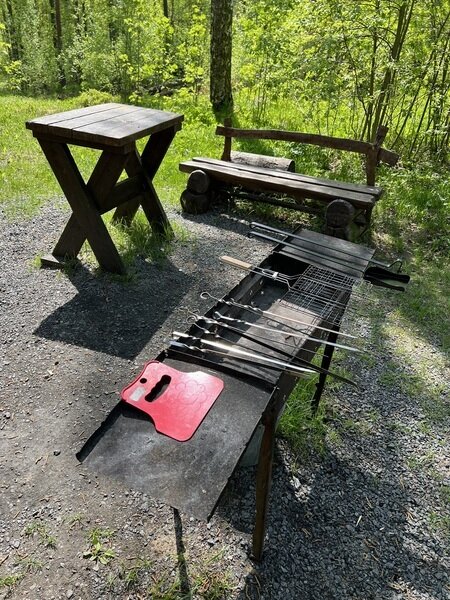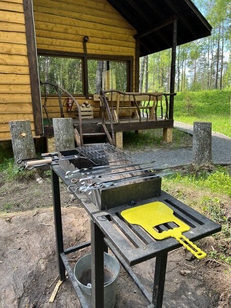 Перед террасой кованый мангал с шампурами у каждого коттеджа.