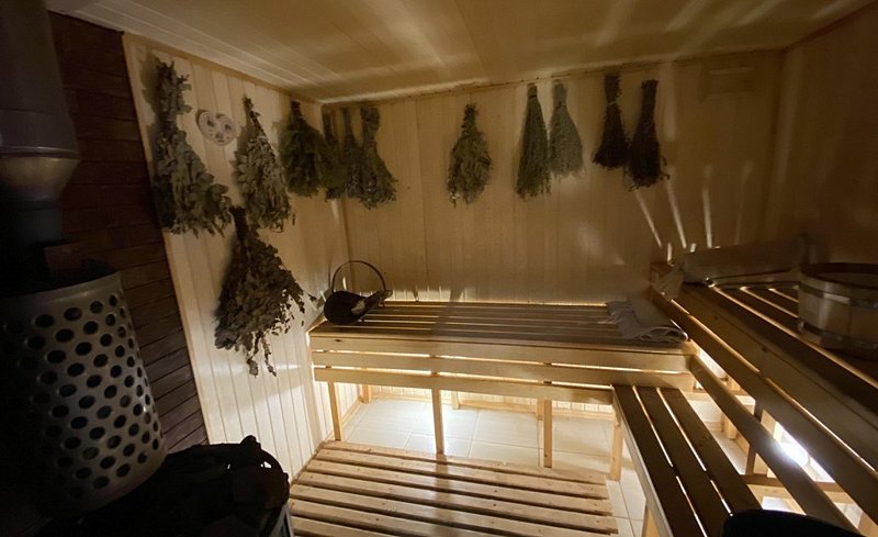 Русская баня расположена прямо в доме и входит в стоимость проживания. Пар и обилие трав, которые украшают стены парной, создают незабываемый комфорт и наслаждение от приятных ароматов.