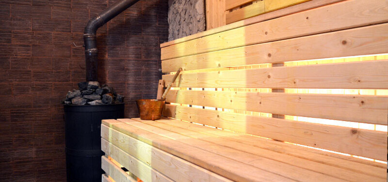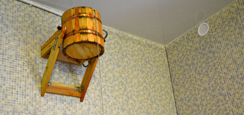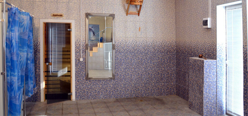 На первом этаже здания баня, которая включает в себя большой уютный холл, кухню, комфортный санузел, парные и бассейн.