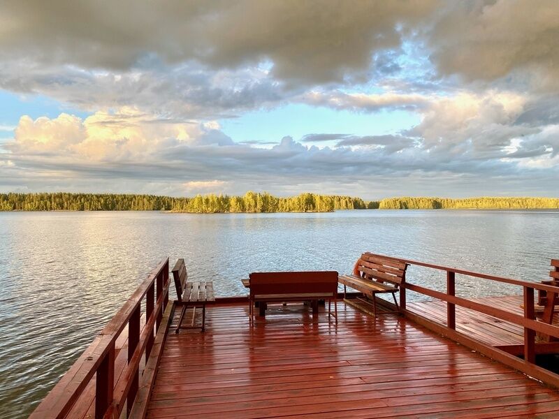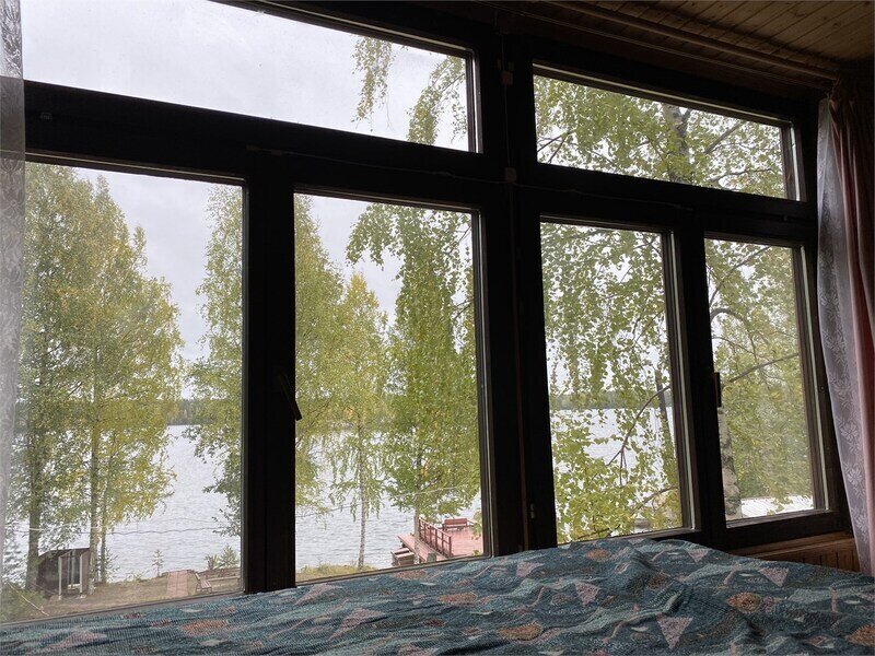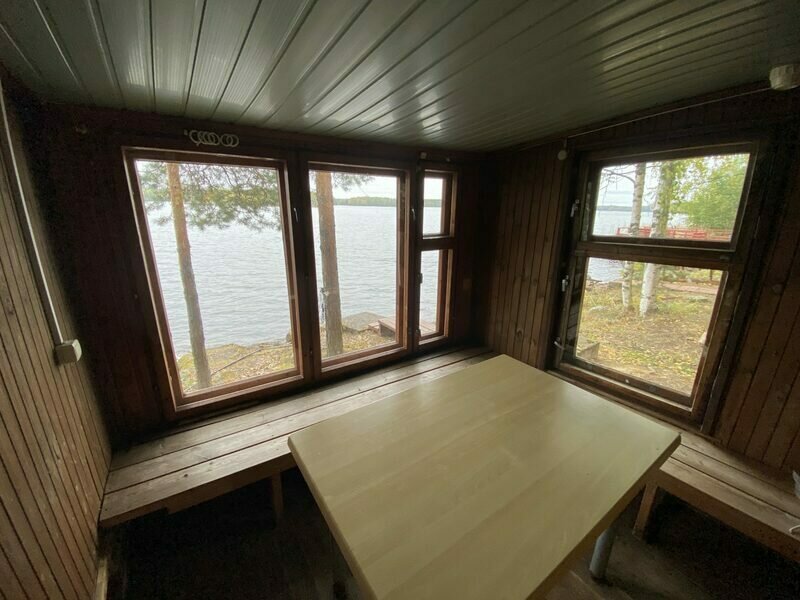 Баня на дровах. Комната отдыха с видом на озеро, рядом пирс для ныряния.