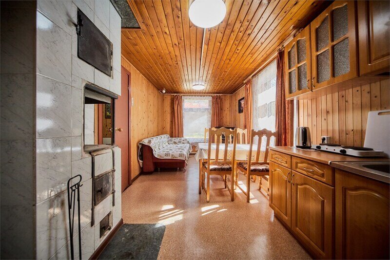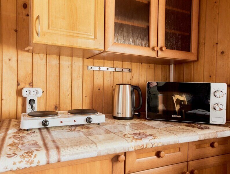 Уютный домик у озера с кухней-гостиной и отдельной спальней. В доме оборудованная и укомплектованная техникой кухня, телевизор, санузел, душ, всегда горячая вода.