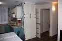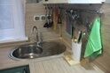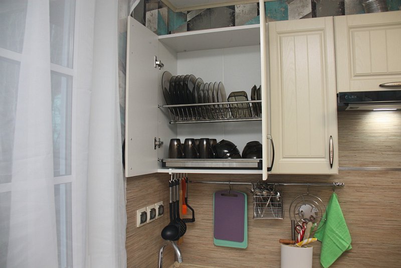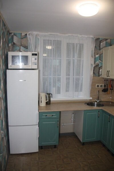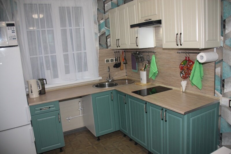 На кухне установлена современная бытовая техника, чтобы гости смогли самостоятельно приготовить любимые блюда. Это холодильник, микроволновая печь, чайник, а также набор посуды.