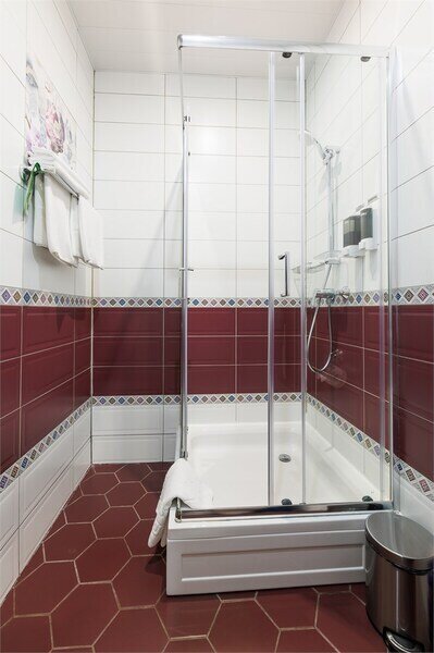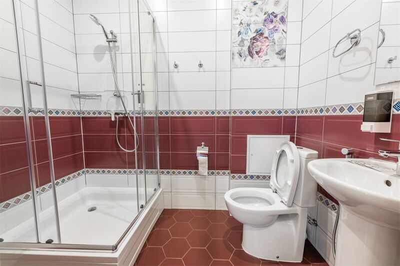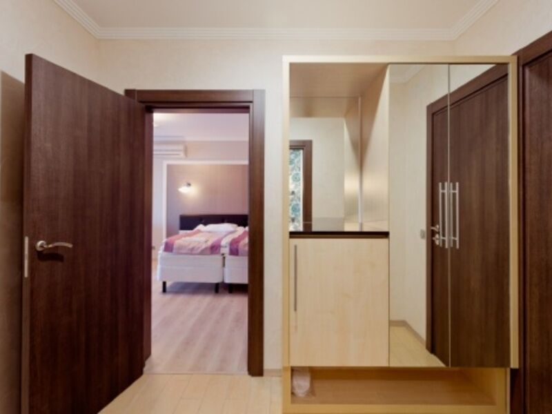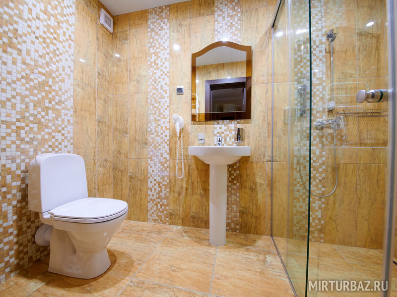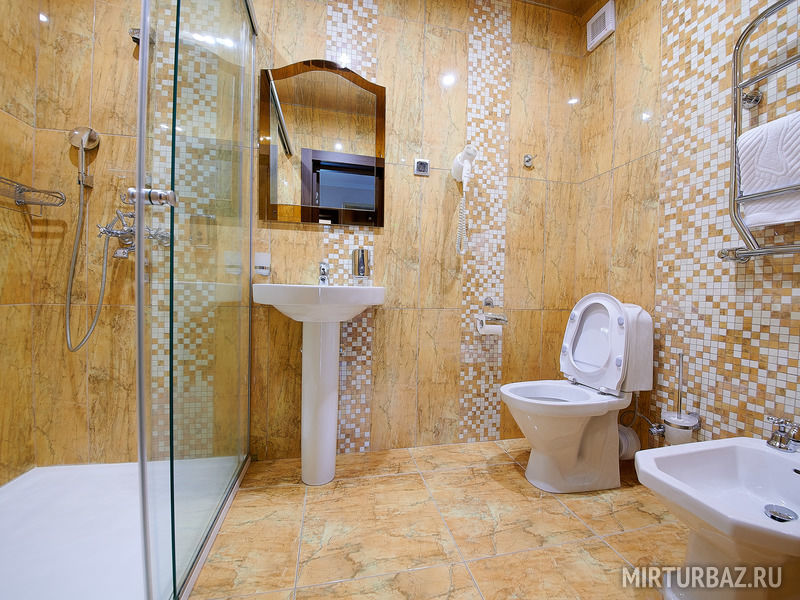Спальня: две односпальные кровати или двуспальная кровать, спутниковое TV, кондиционер, мини-бар, телефон для внутренней связи, полы с подогревом.