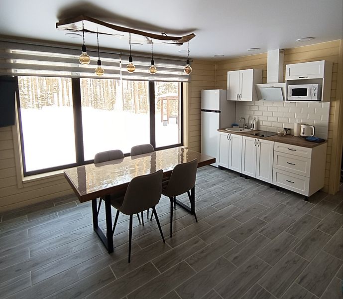 Дом оборудован всей необходимой техникой, тёплыми полами, имеет уютные спальни, душевую со всеми необходимыми принадлежностями, а также просторную и светлую комнату с панорамными окнами, из которой открывается прекрасный вид на прекрасный сосновый лес.